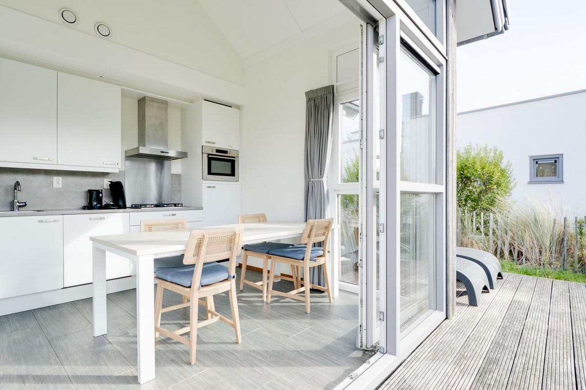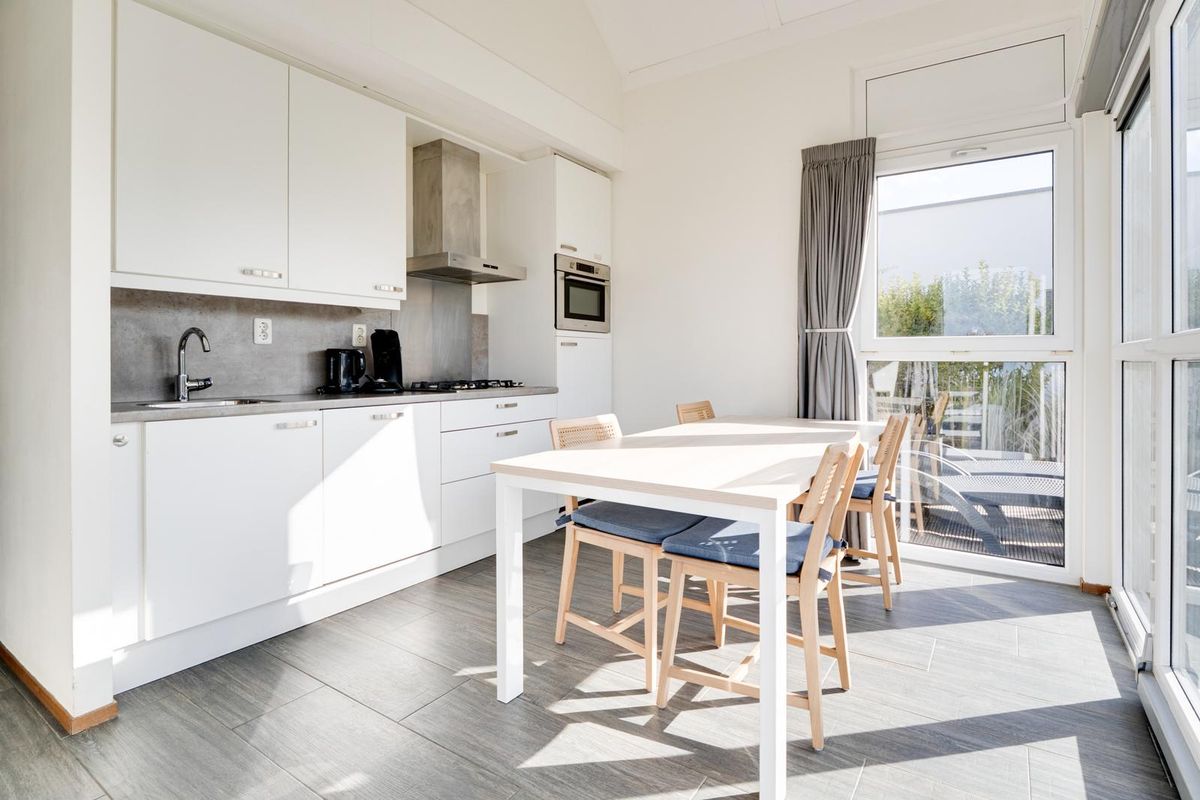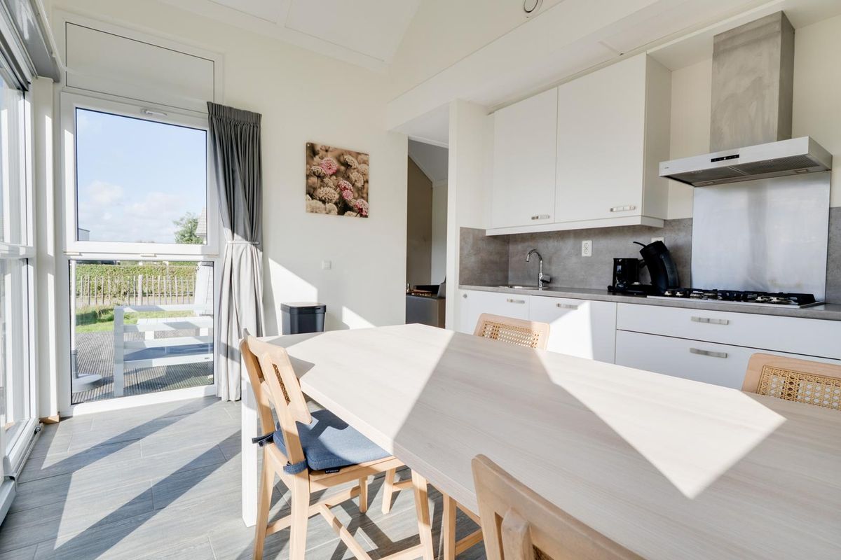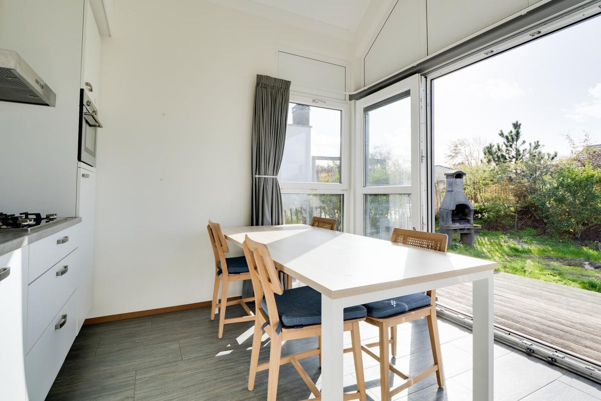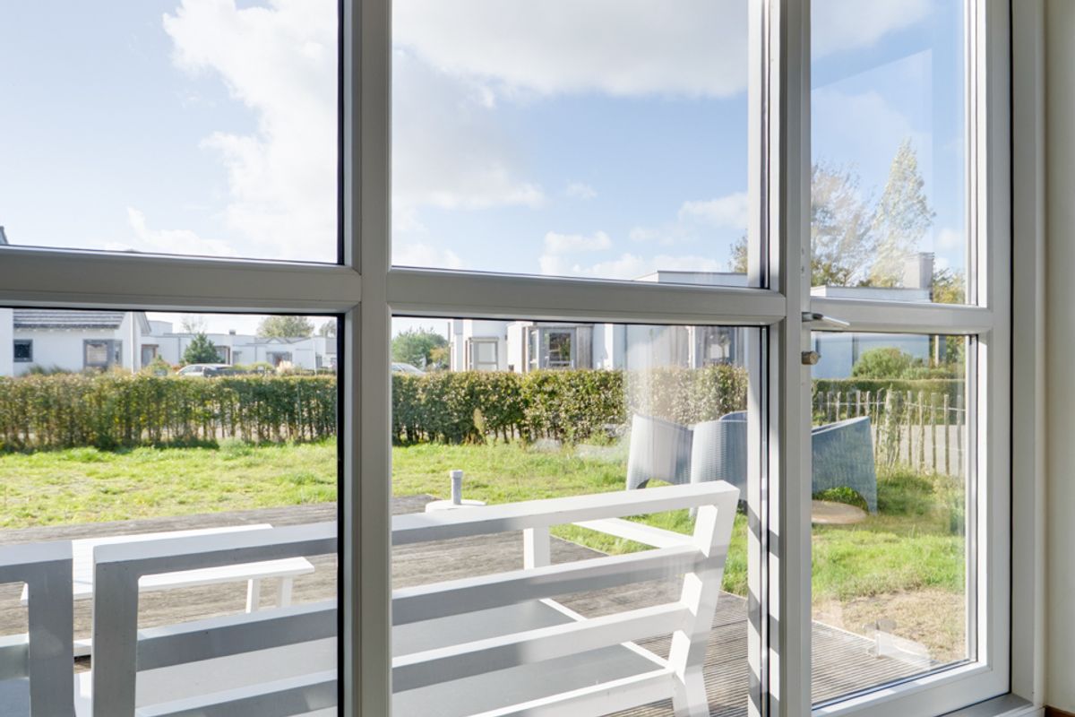 Vanuit de woon- en eetkamer bieden schuifdeuren toegang tot het zeer royale houten vlonderterras, met een afmeting van circa 10 bij 4.80 meter. Dit terras beslaat de gehele breedte van de woning en biedt een aanzienlijke buitenruimte. De jaarlijkse parkkosten inclusief internet en televisie zijn ca. € 2.970. Deze woning wordt momenteel recreatief verhuurd door Roompot, waardoor het niet alleen een persoonlijk toevluchtsoord is, maar ook een slimme investering die zorgt voor rendement.
