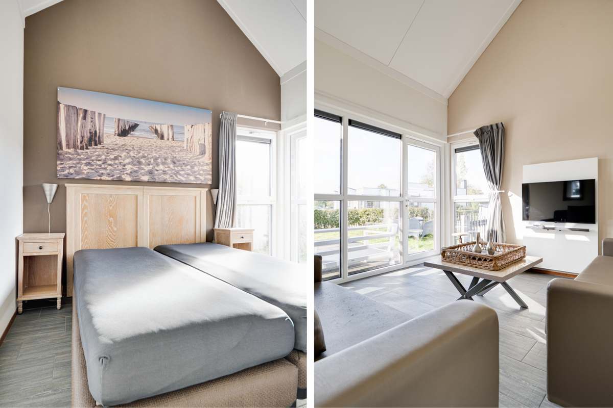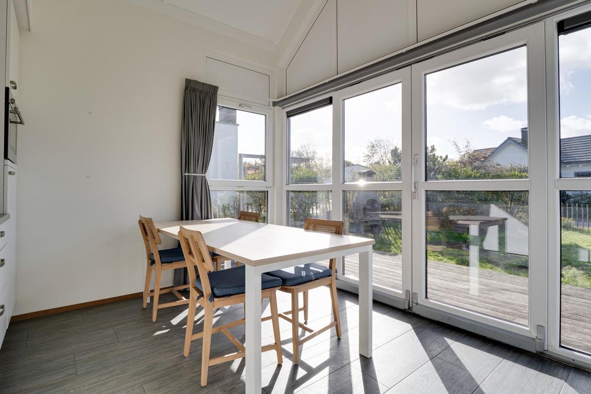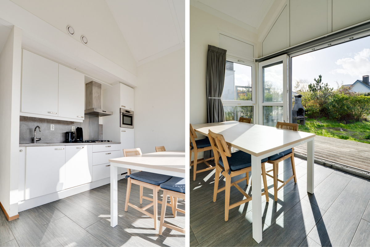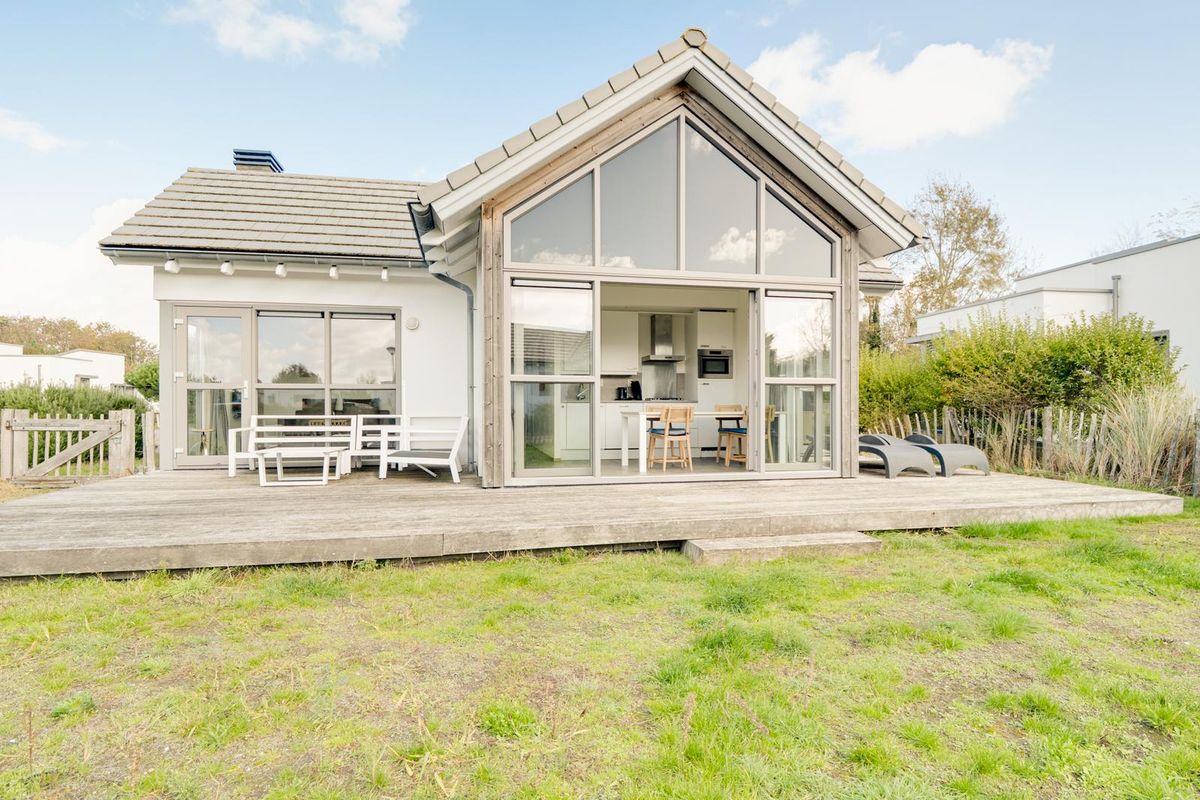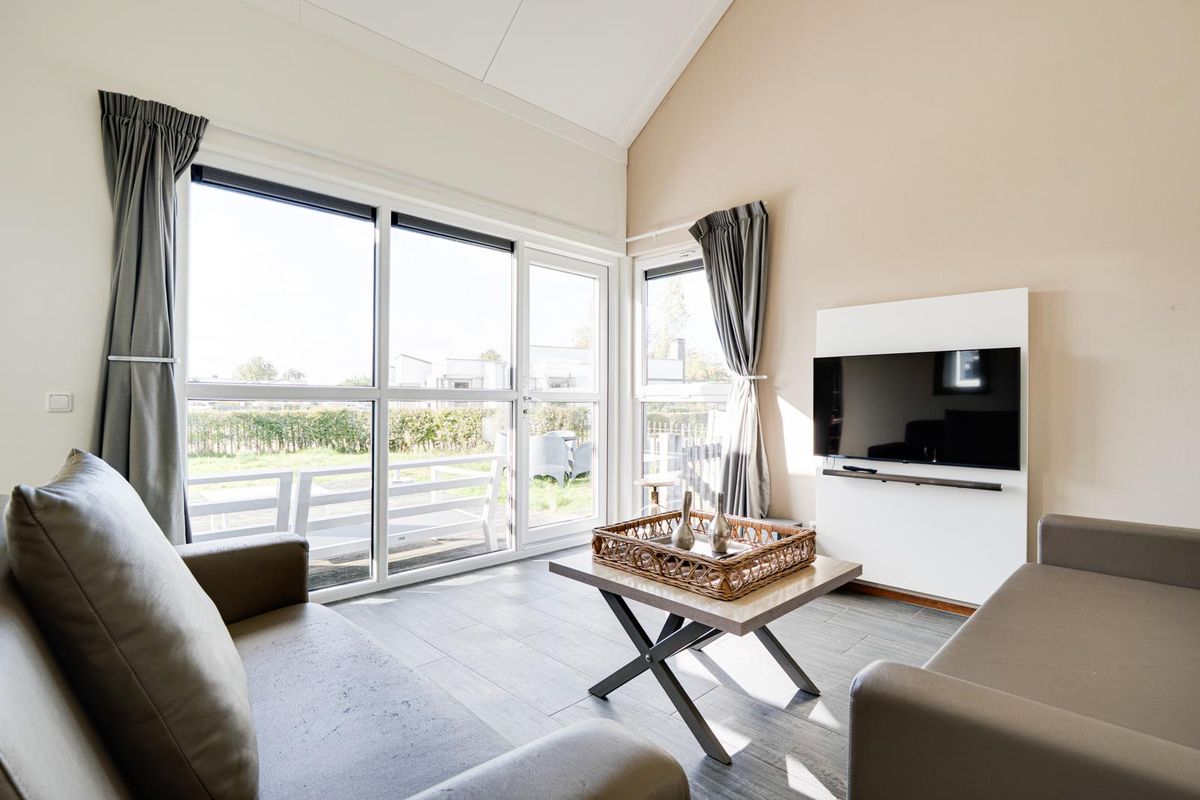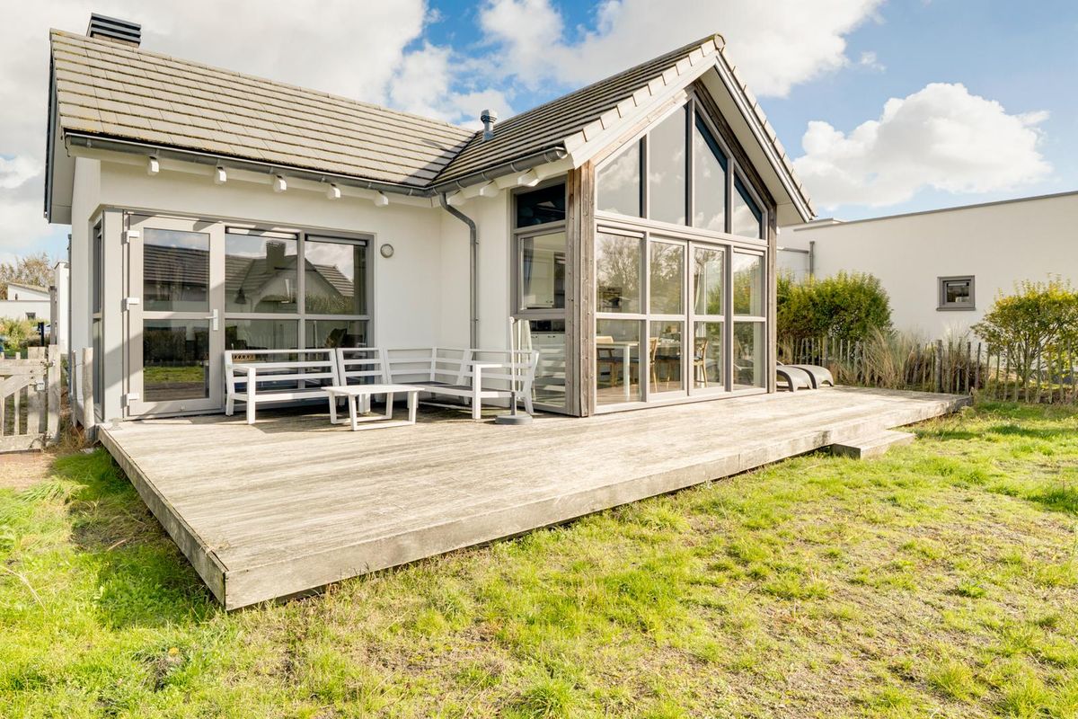 Vanuit de woon- en eetkamer bieden schuifdeuren toegang tot het zeer royale houten vlonderterras, met een afmeting van circa 10 bij 4.80 meter. Dit terras beslaat de gehele breedte van de woning en biedt een aanzienlijke buitenruimte. De jaarlijkse parkkosten inclusief internet en televisie zijn ca. € 2.970. Deze woning wordt momenteel recreatief verhuurd door Roompot, waardoor het niet alleen een persoonlijk toevluchtsoord is, maar ook een slimme investering die zorgt voor rendement.