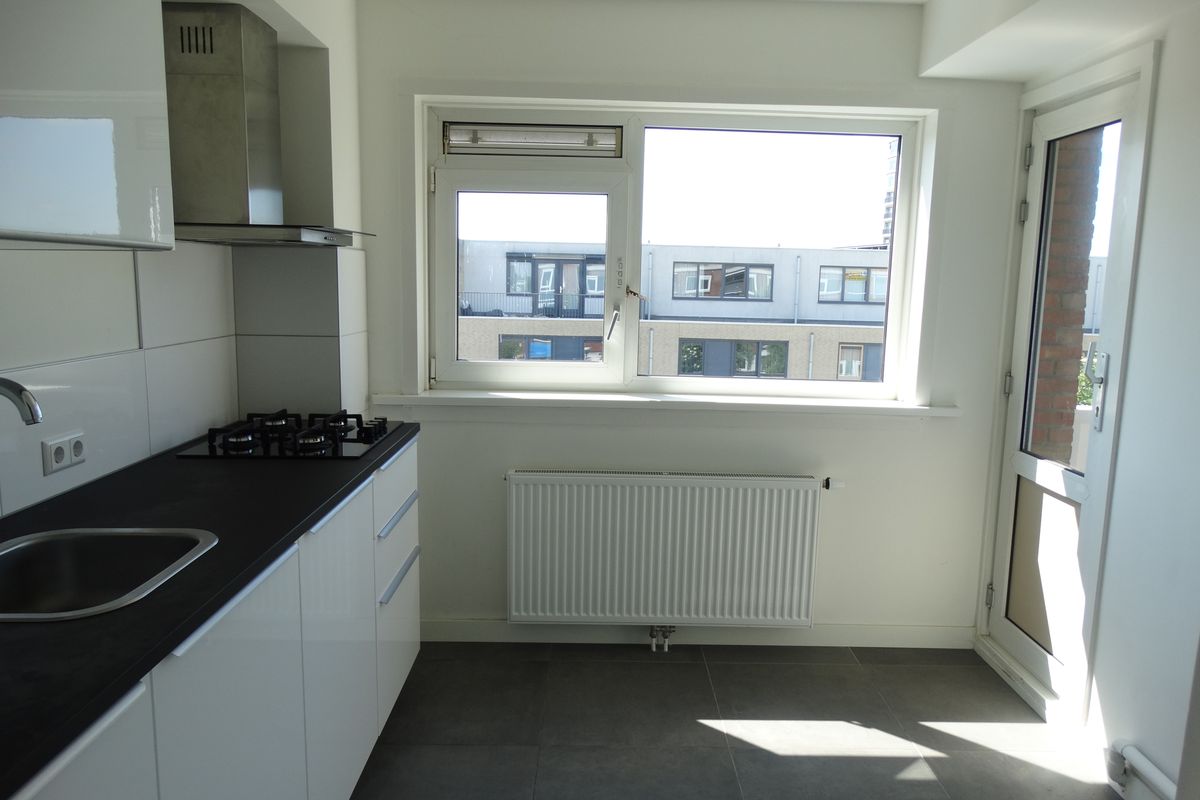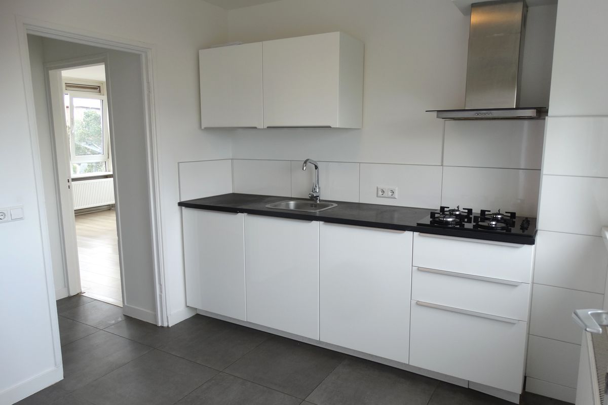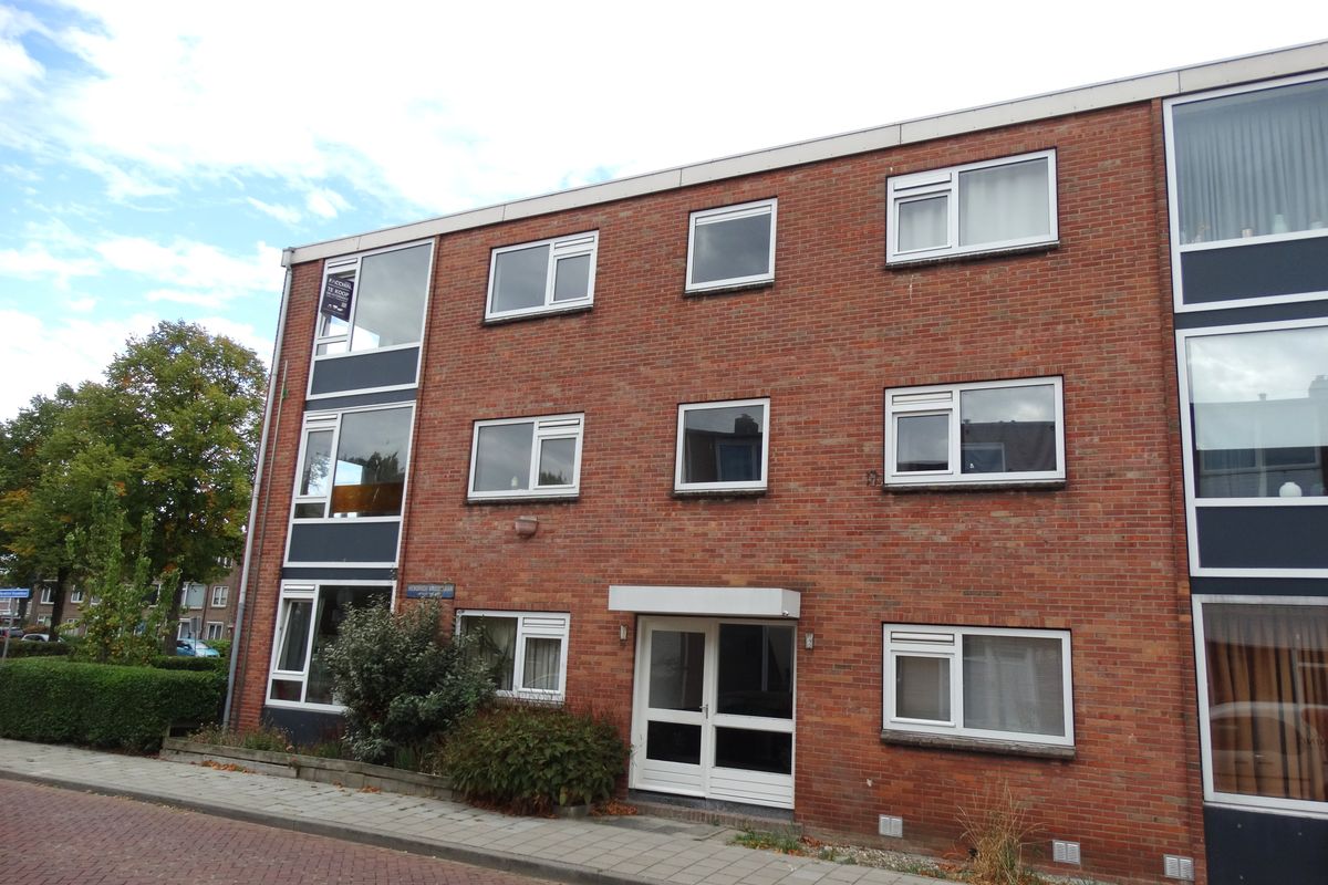 Appartement: hal met toiletruimte, ruime moderne keuken (ca. 6 m²) voorzien van onder- en bovenkasten, lades, gaskookplaat en afzuigkap. Tevens bevindt zich hier de wasmachine-aansluiting en opstelling c.v.-combiketel. Ook is er ruimte om een vaatwasser te plaatsen. Vanuit de keuken is er toegang tot een klein, maar zonnig balkon. De lichte woonkamer (ca. 17 m²) met veel lichtinval is voorzien van een vaste kast en een schouw. Verder zijn er 2 slaapkamers aanwezig (ca. 11 m² en 12 m²). De badkamer is eenvoudig, maar netjes van uitvoering voorzien van een wastafel met meubel.