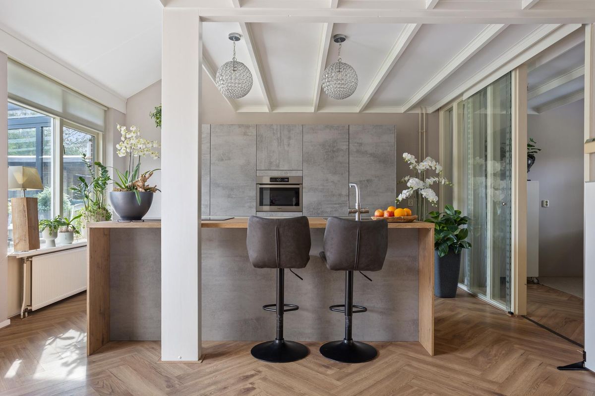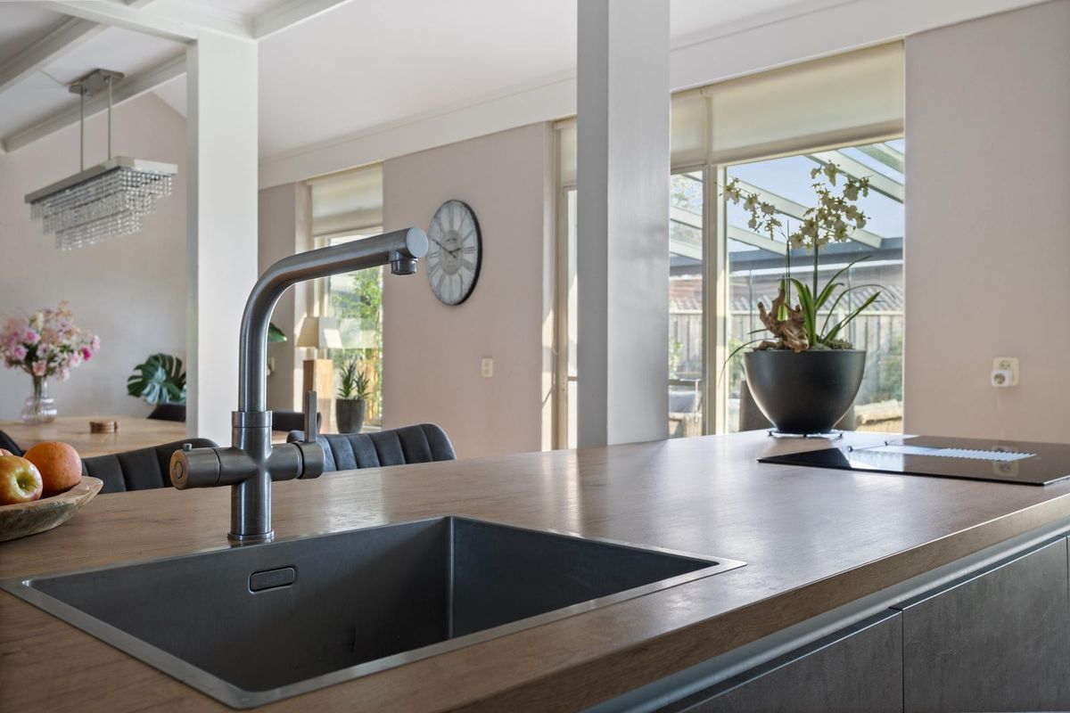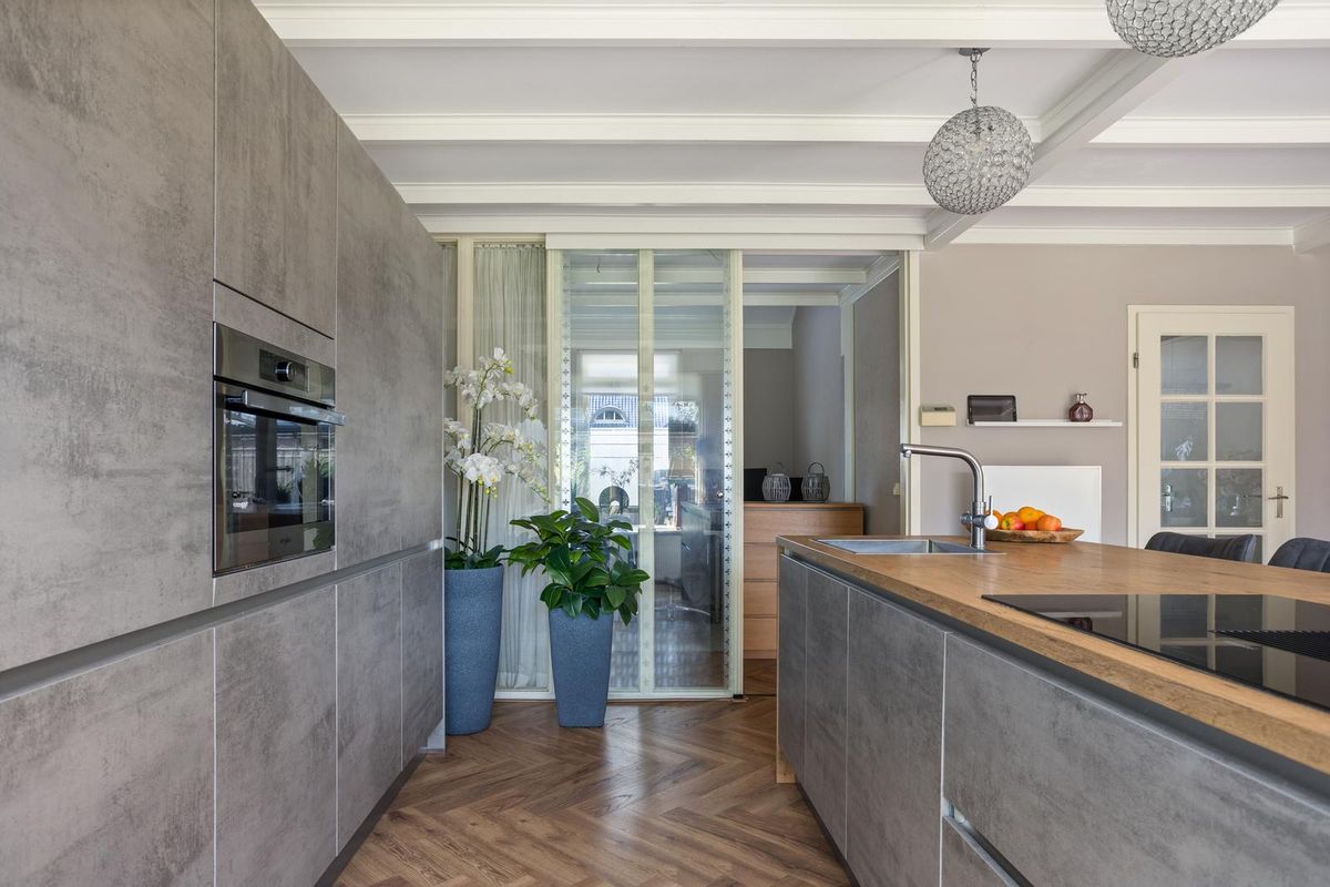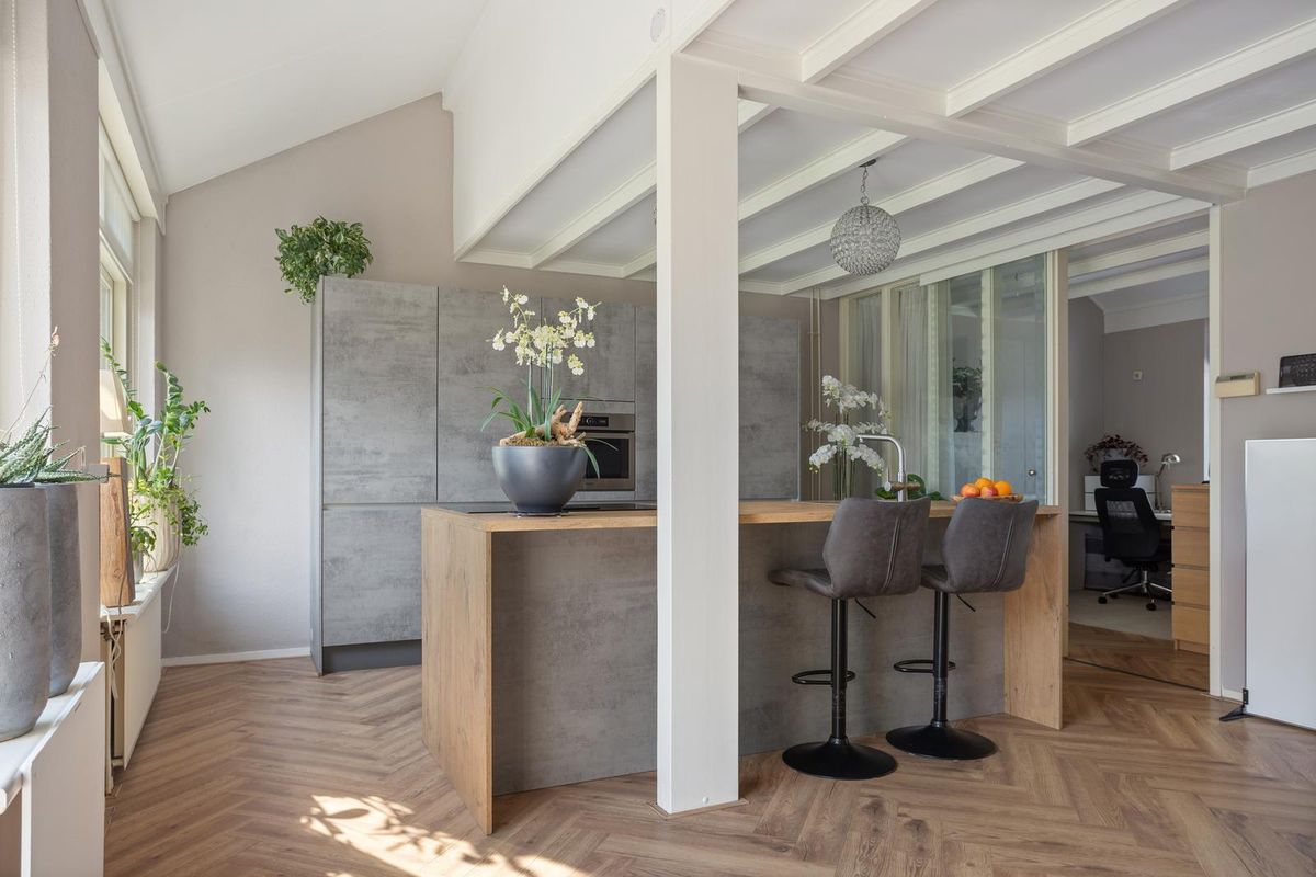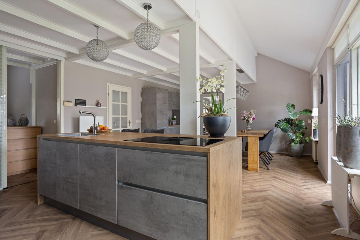 Vanuit de hal stap je de royale leefkeuken in met een doorloop naar de serre en de tuin. Hier is volop ruimte om te koken en te genieten met elkaar.