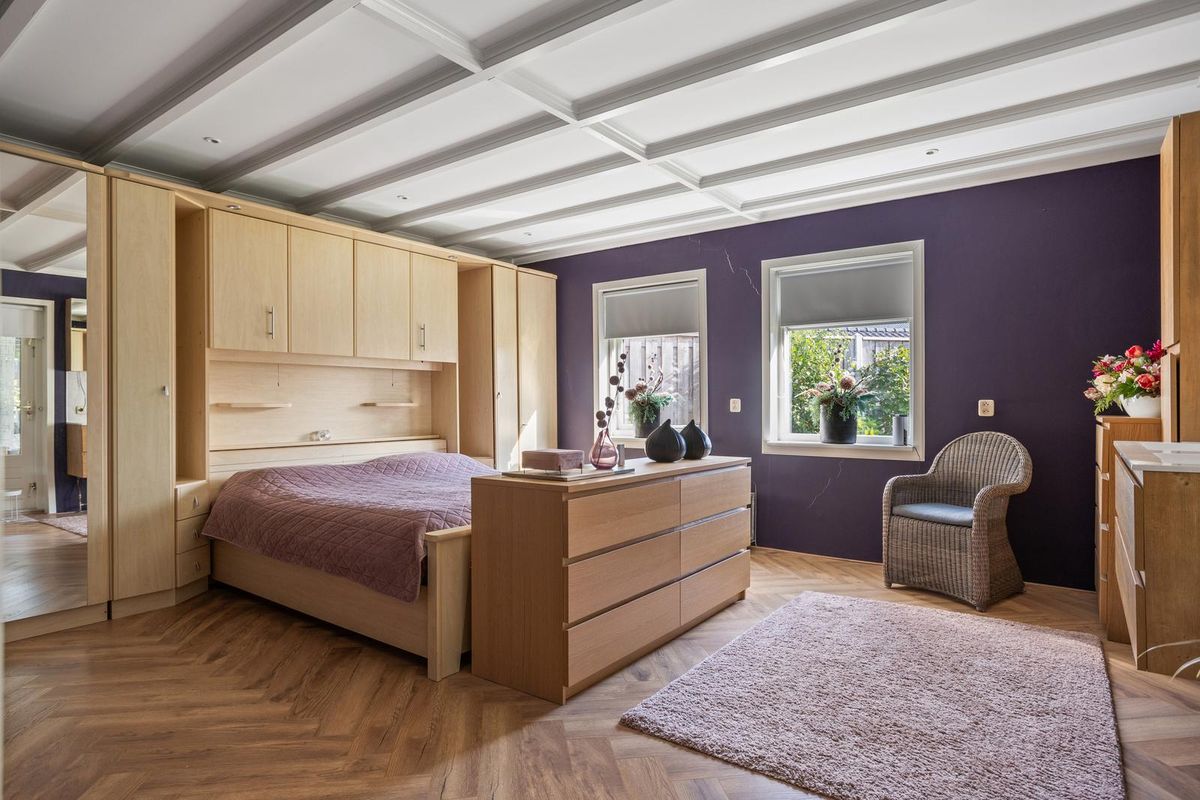 Vanuit de woonkamer bereik je de slaapkamer met een wastafelmeubel. Hier is voldoende ruimte voor een lits-jumeaux bed en een kastenwand.