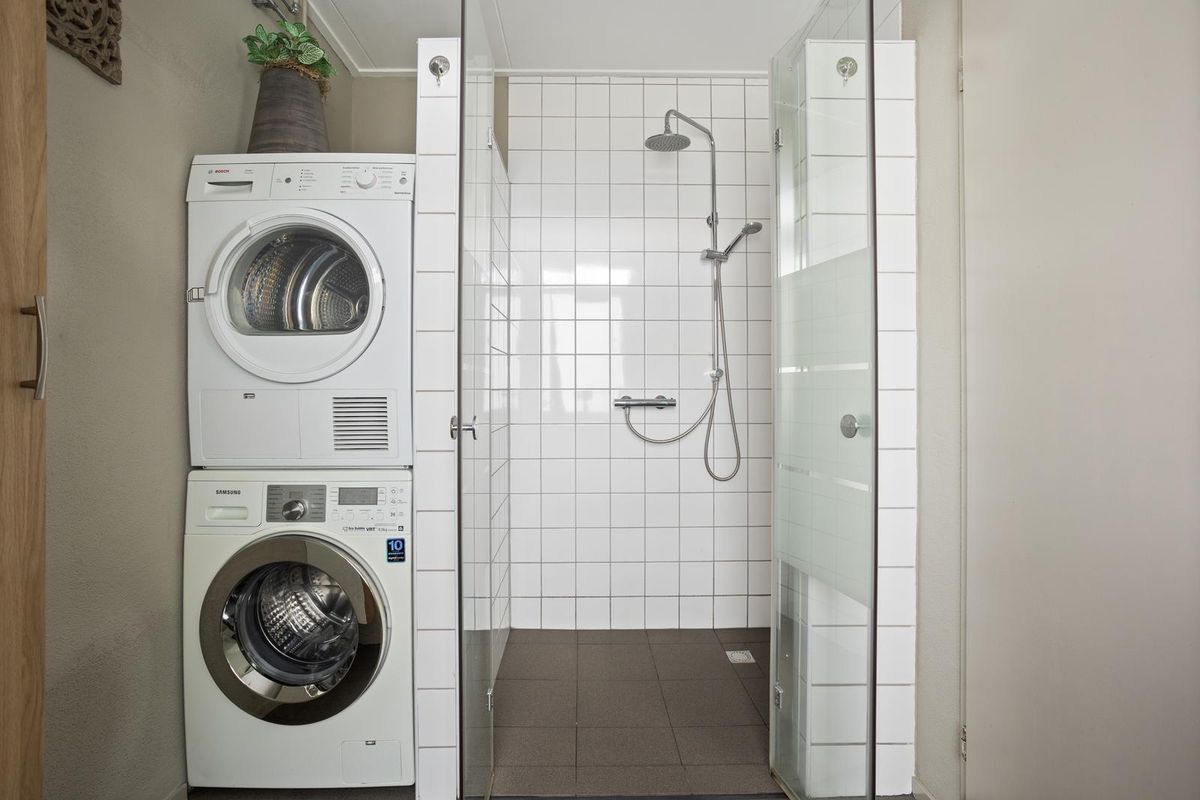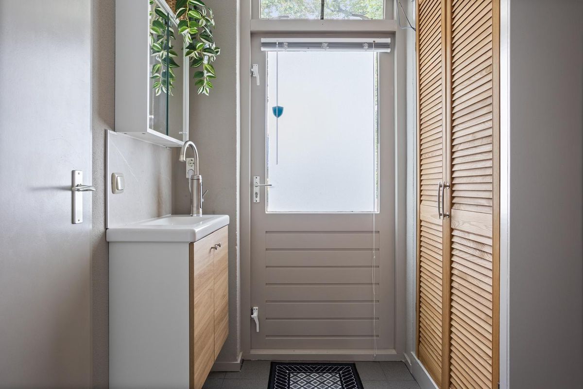 Via de voordeur stap je de entree binnen met de trapopgang, een apart toilet met fonteintje en de bijkeuken met de witgoedaansluiting, een cv-kast en een deur naar de straatzijde. Deze ruimte is nu ook in gebruik als badkamer en voorzien van een douchehoek en wastafel.