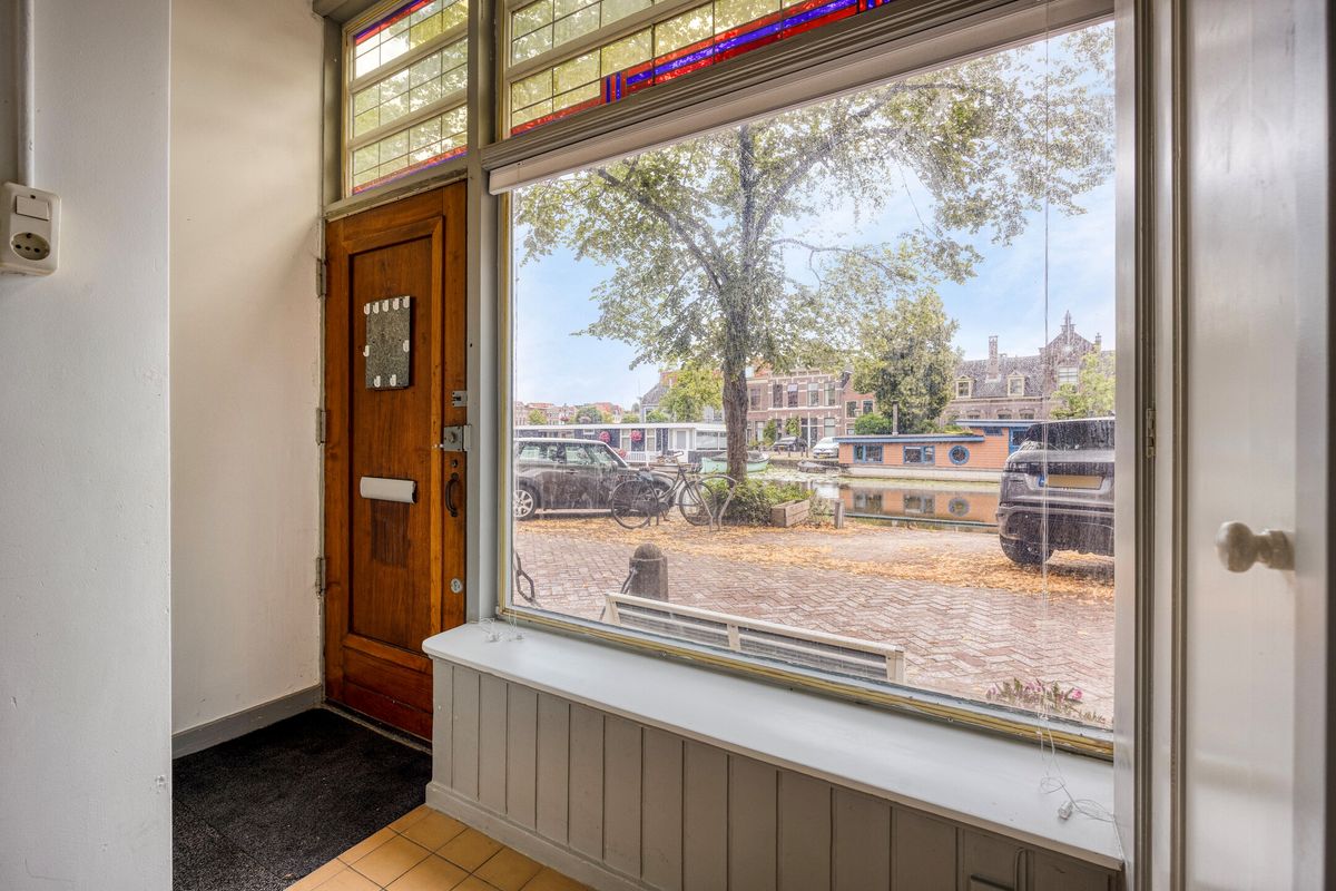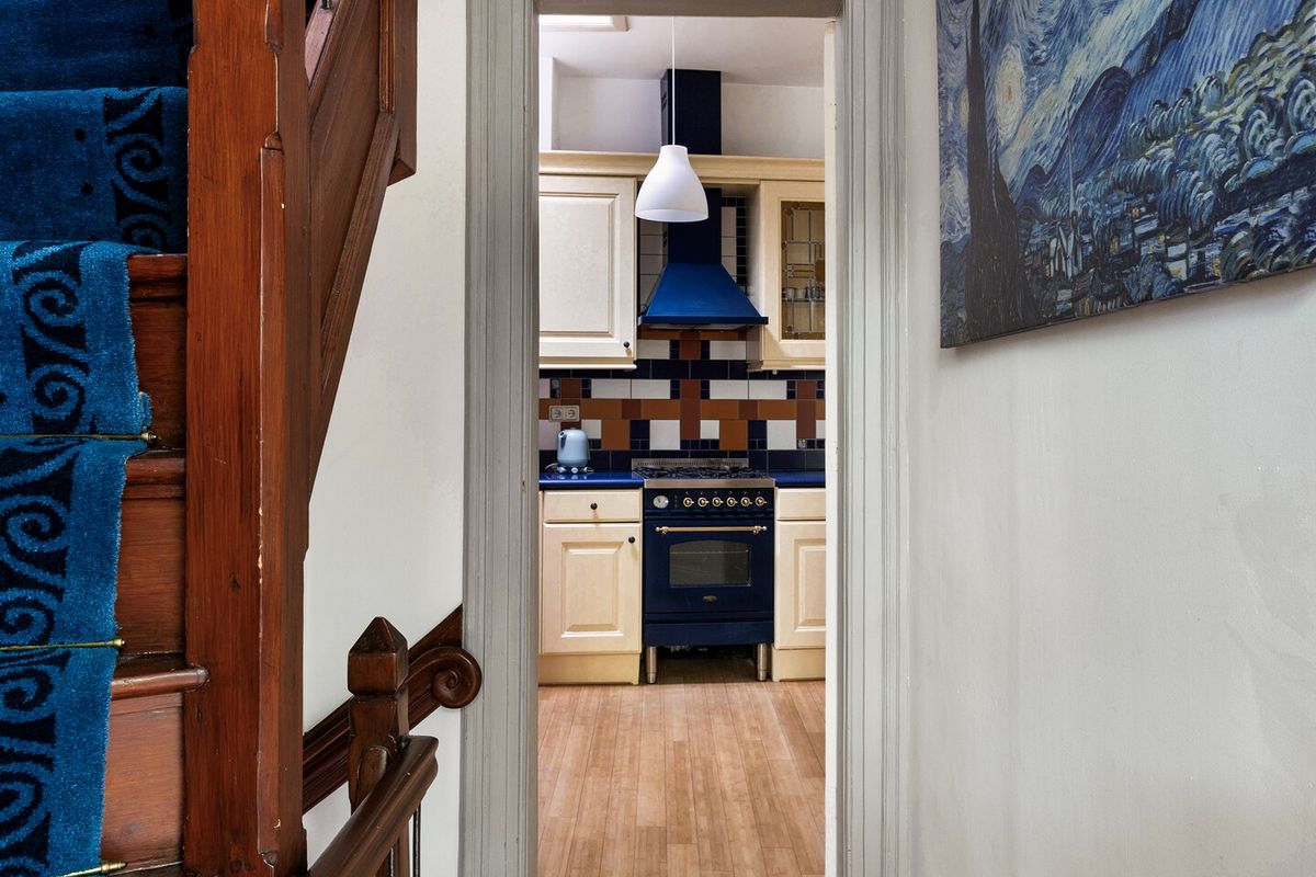 Stairs to the first floor. The hallway leads to the living room, kitchen, and stairs to the top floor. The bright living room offers a fantastic view of the canal; in summer, countless boats drive by, creating a wonderful atmosphere. If you let your imagination run wild, you could easily picture a VOC trading ship sailing by. The living room flows into the spacious, bright kitchen. The kitchen is equipped with a refrigerator, freezer, dishwasher, microwave, oven, gas hob with extractor hood, and sink.