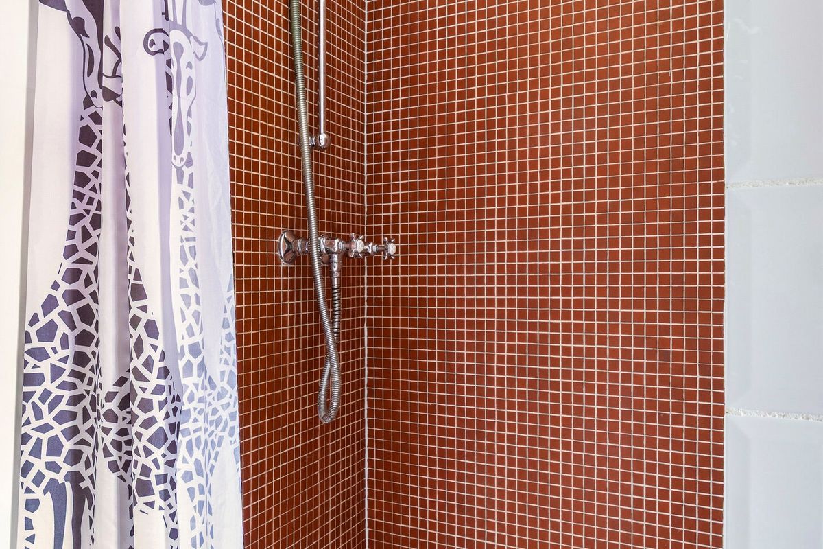 The bathroom is equipped with a shower, bathtub, sink, toilet, and washing machine. Modern conveniences are combined in a style that harmoniously blends with the character of the building.