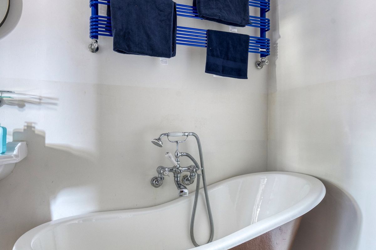 De badkamer is uitgerust met douche, ligbad, wastafel, toilet en wasmachine. De gemakken van de moderne tijd, in een stijl die harmonieus samen gaat met het karakter van het pand.