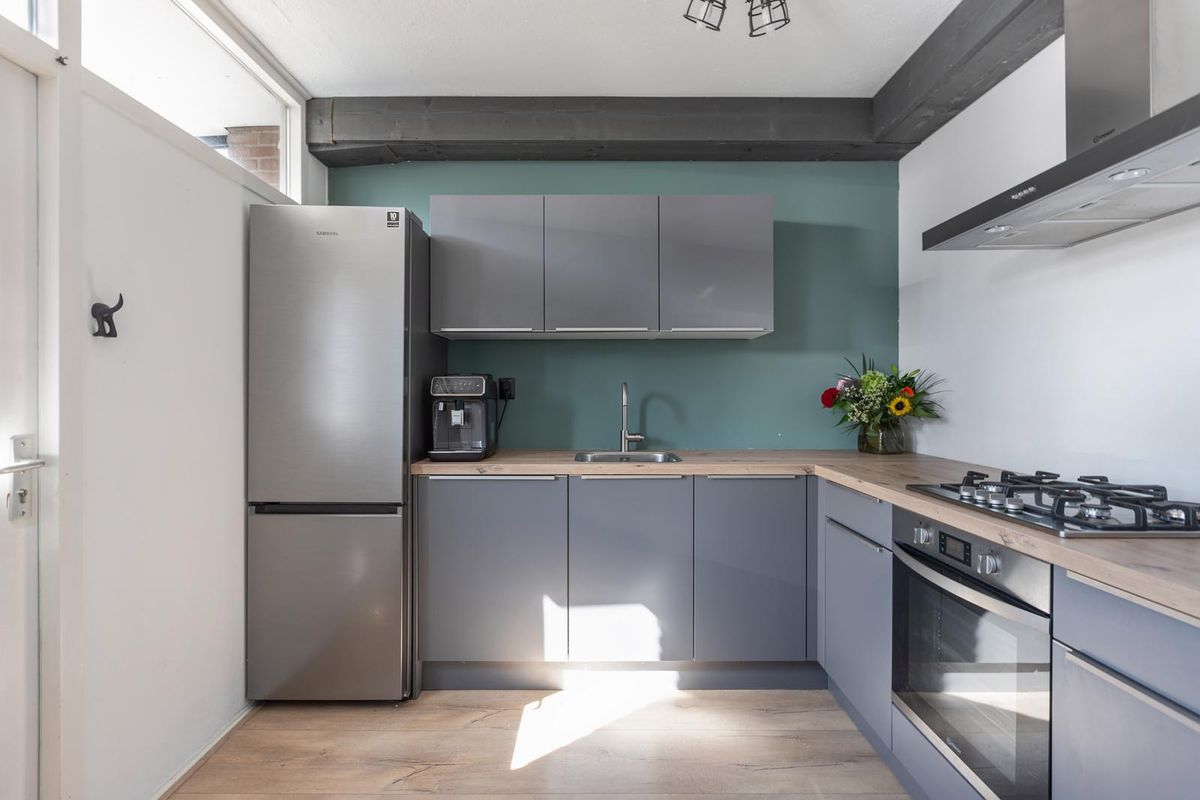 Via de hal met toilet bereikt u de zonnige woonkamer (ca. 25 m2) met een laminaatvloer en met een deur naar de de achtertuin. Aan de achterzijde ligt de open keuken. Deze is aangevuld met een nette keuken opstelling in moderne kleuren en voorzien van diverse inbouwapparatuur, o.a. een vier pits gaskookplaat, combi-oven, koel-vriescombinatie, afzuigkap en een vaatwasser.