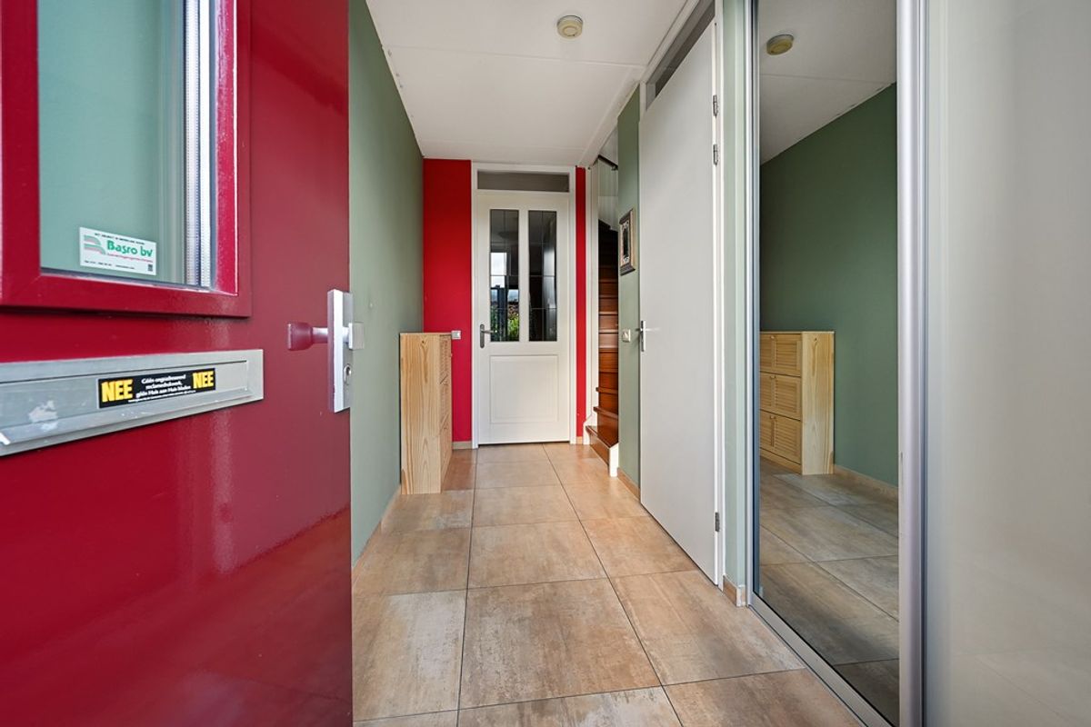 U komt binnen via de ruime hal met garderobe, uitgebreide meterkast, toiletruimte met fonteintje en trapopgang.