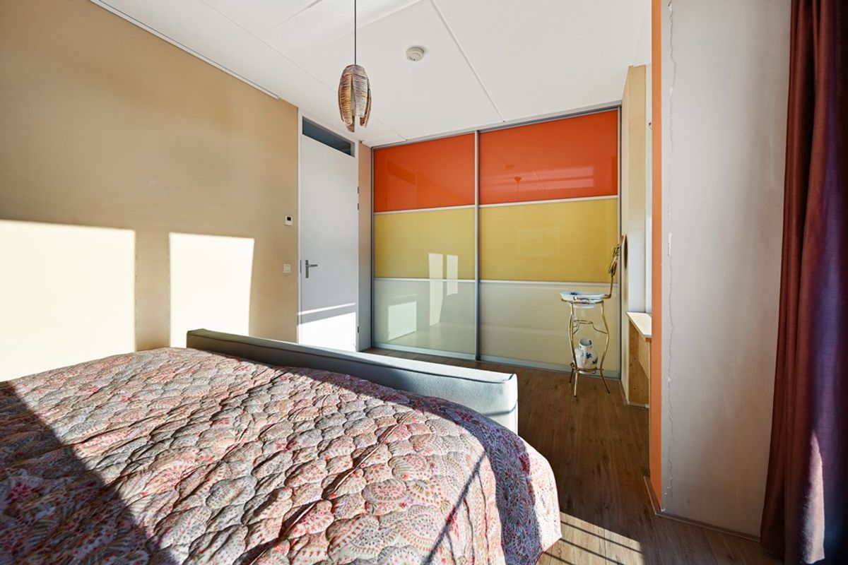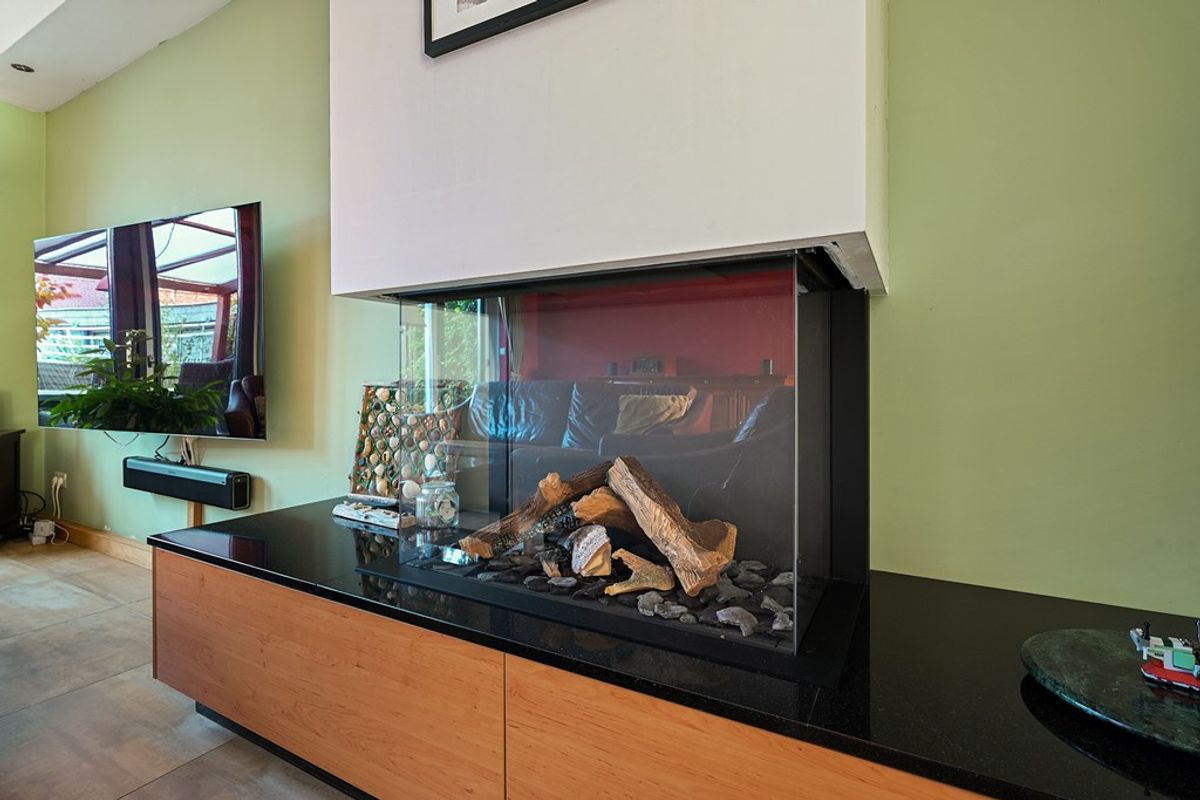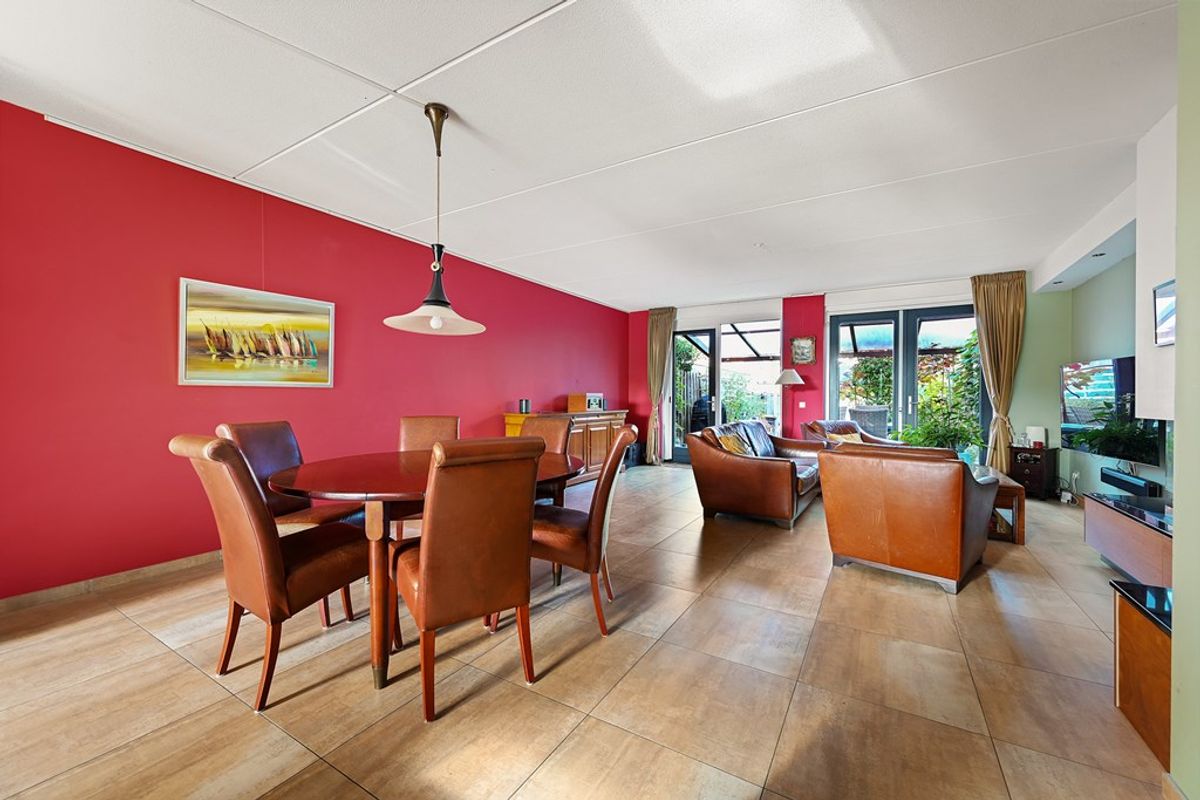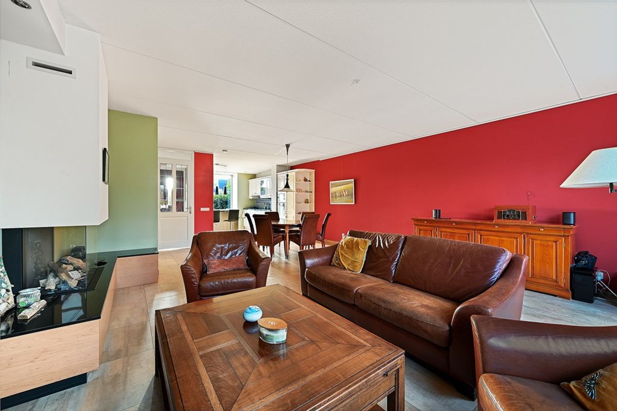 De tuingerichte woonkamer is voorzien van vloerverwarming en biedt door de grote raampartijen een fijne lichtinval. Openslaande deur (en) geven toegang tot de zonnige achtertuin op het westen, waar u in de middag en avond heerlijk van de zon kunt genieten. Verder is er een grote voorraadkast aanwezig en het fraaie wandmeubel met ingebouwde gashaard maakt het geheel compleet.