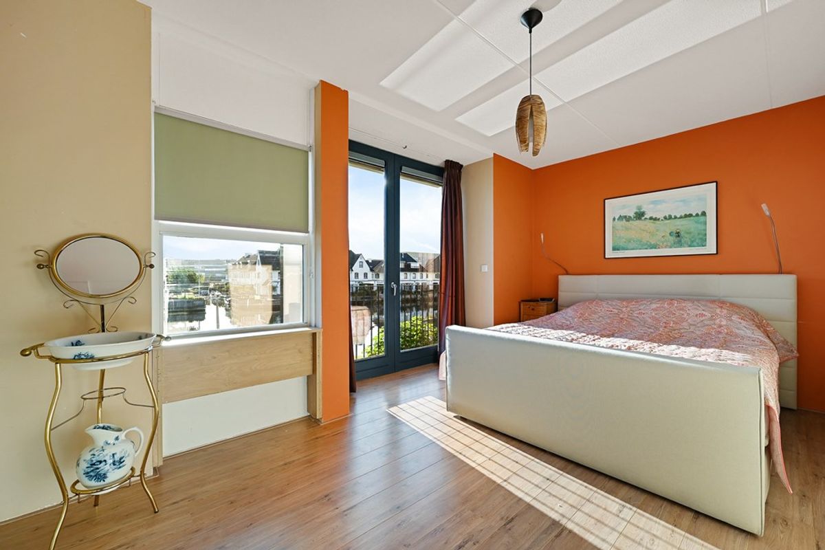 Overloop. Opnieuw twee ruime slaapkamers met inbouwkast, een tweede, complete badkamer met inloopdouche en wastafel, een derde toilet en een royale was-/stookruimte. Ook hier is de voorslaapkamer voorzien van een Frans balkon met zicht op het water.