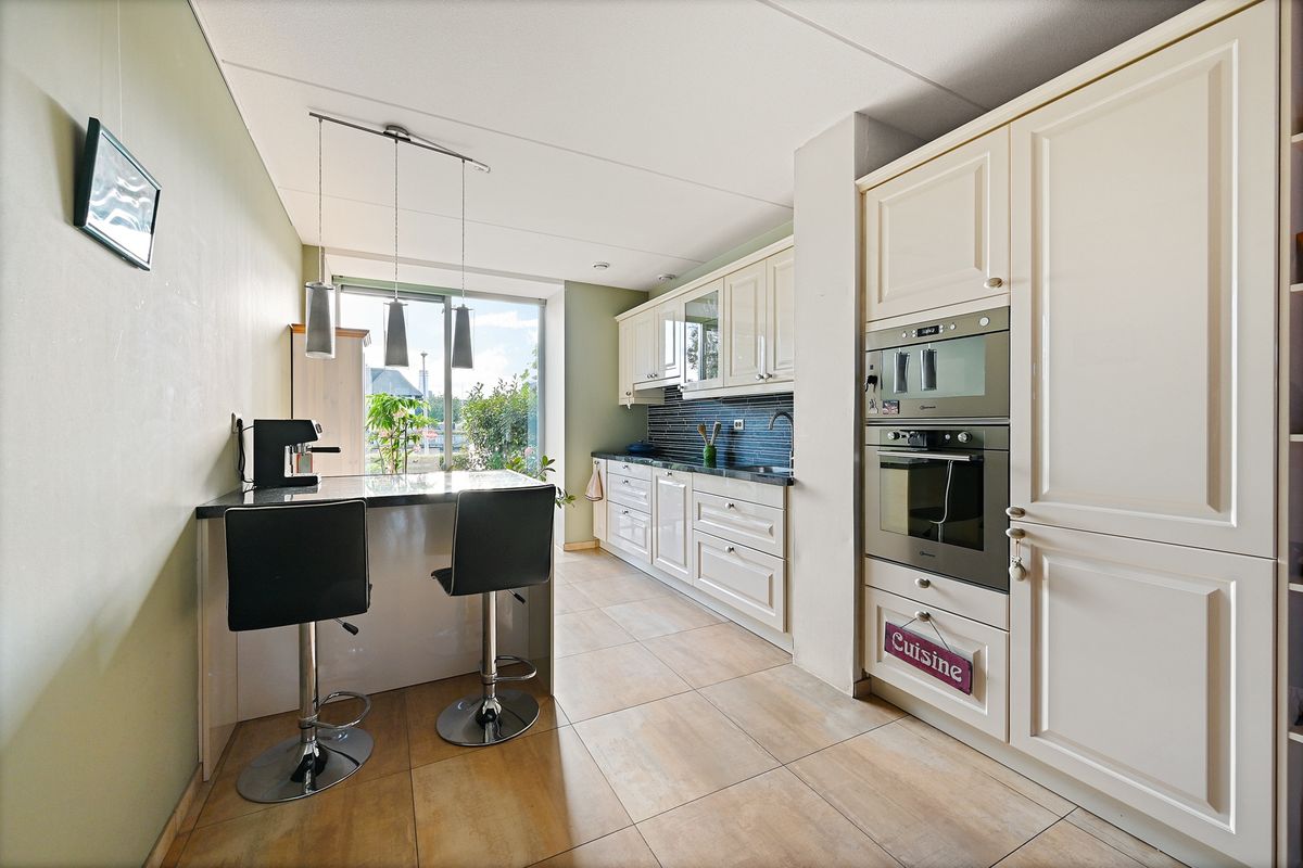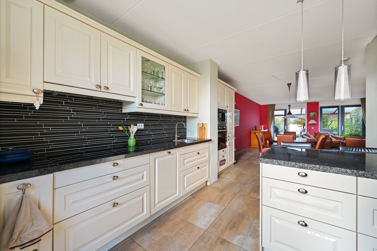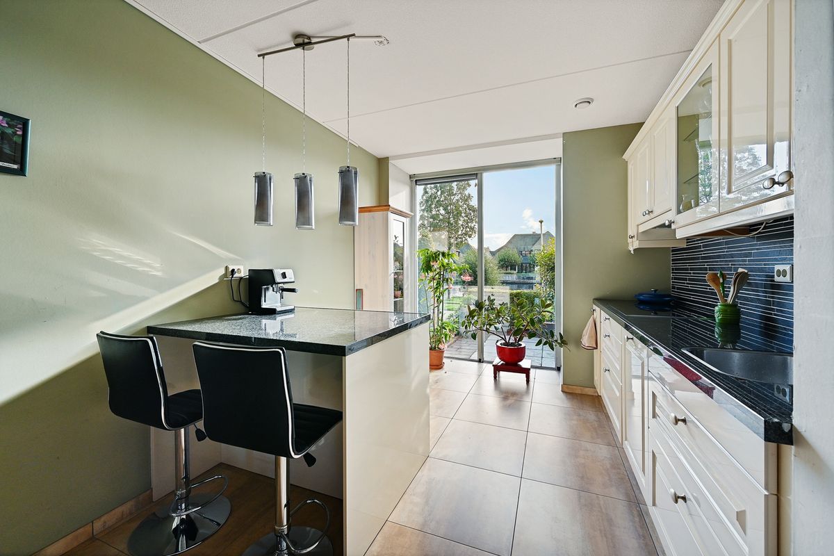 Aan de voorzijde van de woning vindt u de gezellige keuken, compleet met diverse inbouwapparatuur en uitzicht over het water. Een sfeervolle plek om de dag te beginnen.