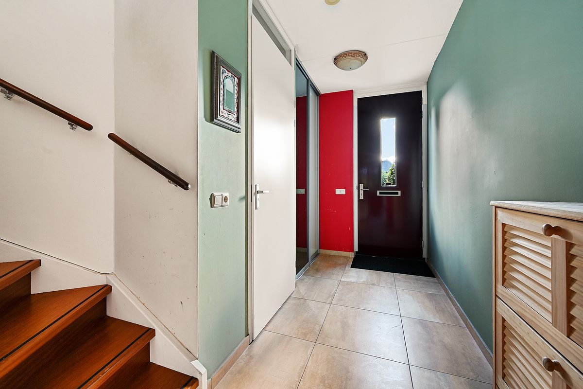 U komt binnen via de ruime hal met garderobe, uitgebreide meterkast, toiletruimte met fonteintje en trapopgang.