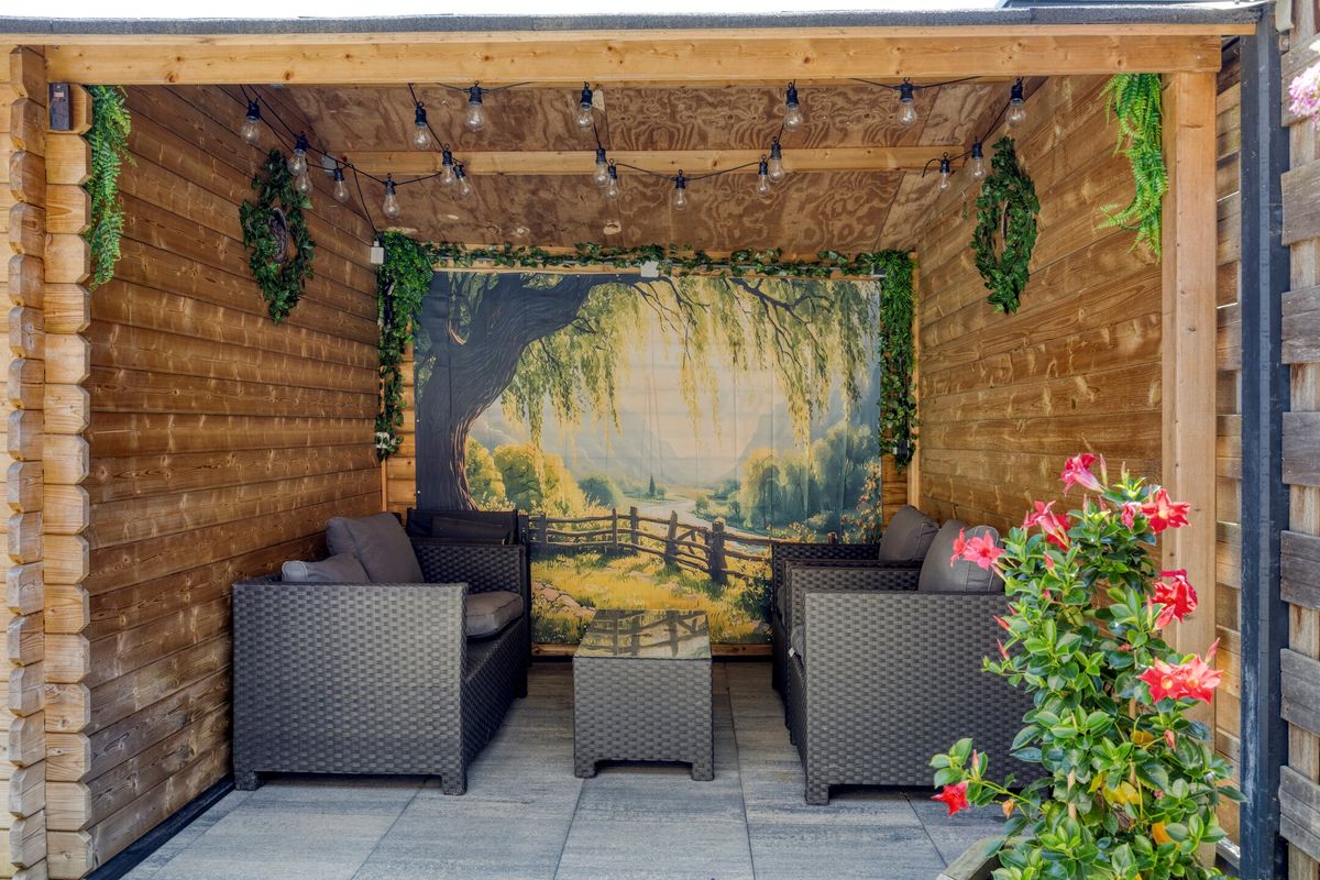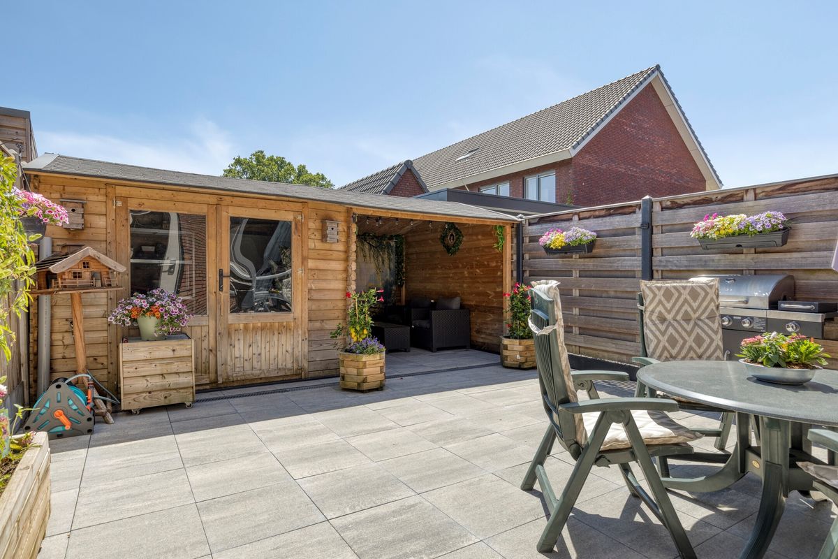 Zonnige, onderhoudsarme tuin met berging en overkapping