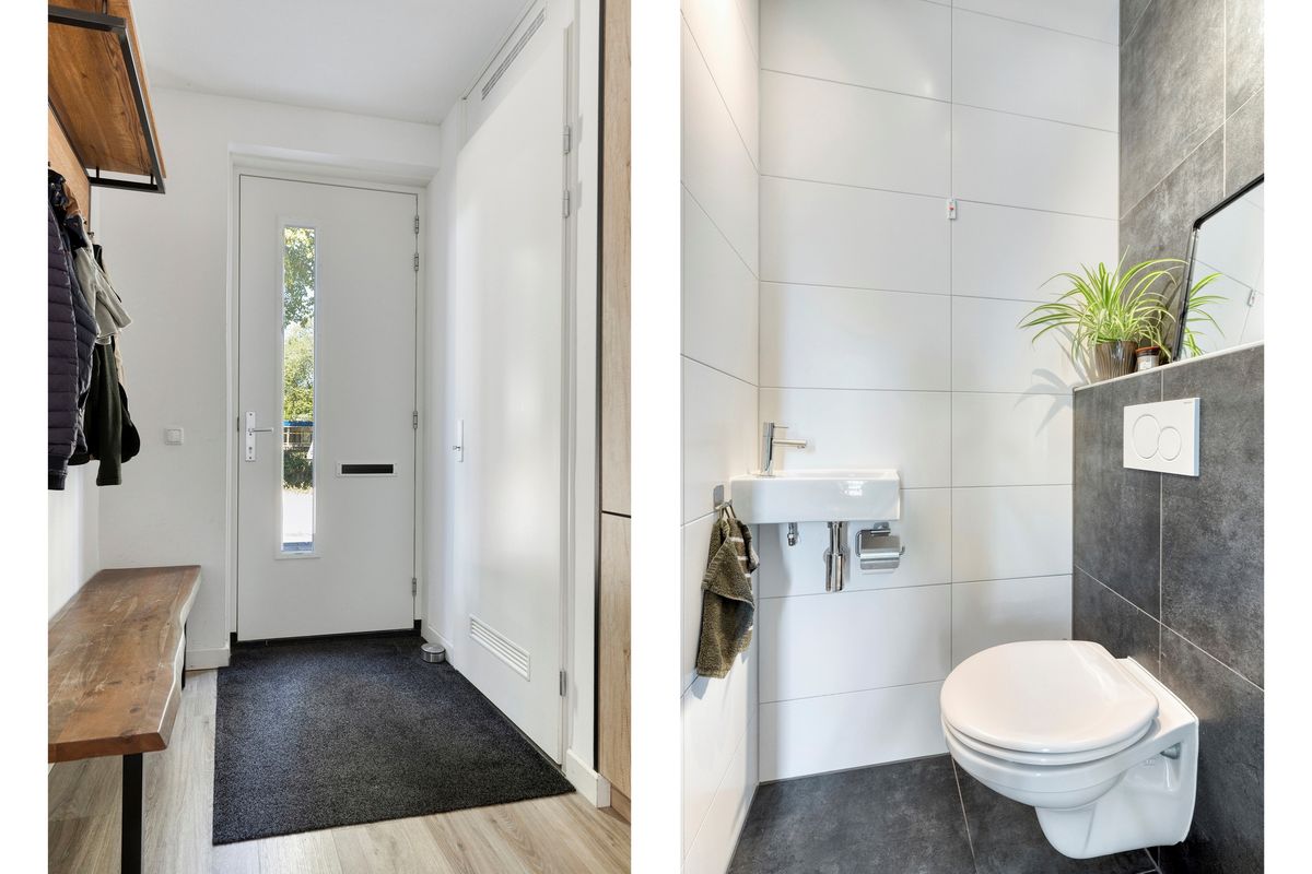 Een goed onderhouden voortuin leidt u naar de entree van de woning, waar u binnenkomt in de verzorgde hal. Deze ruimte is niet alleen een uitnodigende binnenkomst, maar biedt ook praktisch comfort. Er is voldoende plek voor een kapstok of klein opbergmeubel en vanuit hier heeft u toegang tot de toiletruimte, de trapopgang naar de eerste verdieping en uiteraard de woonkamer. Een slimme indeling die sfeer en functionaliteit combineert.