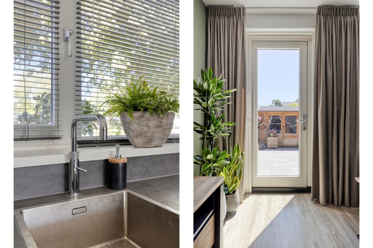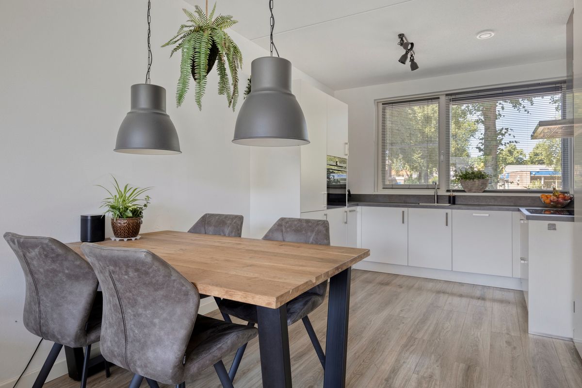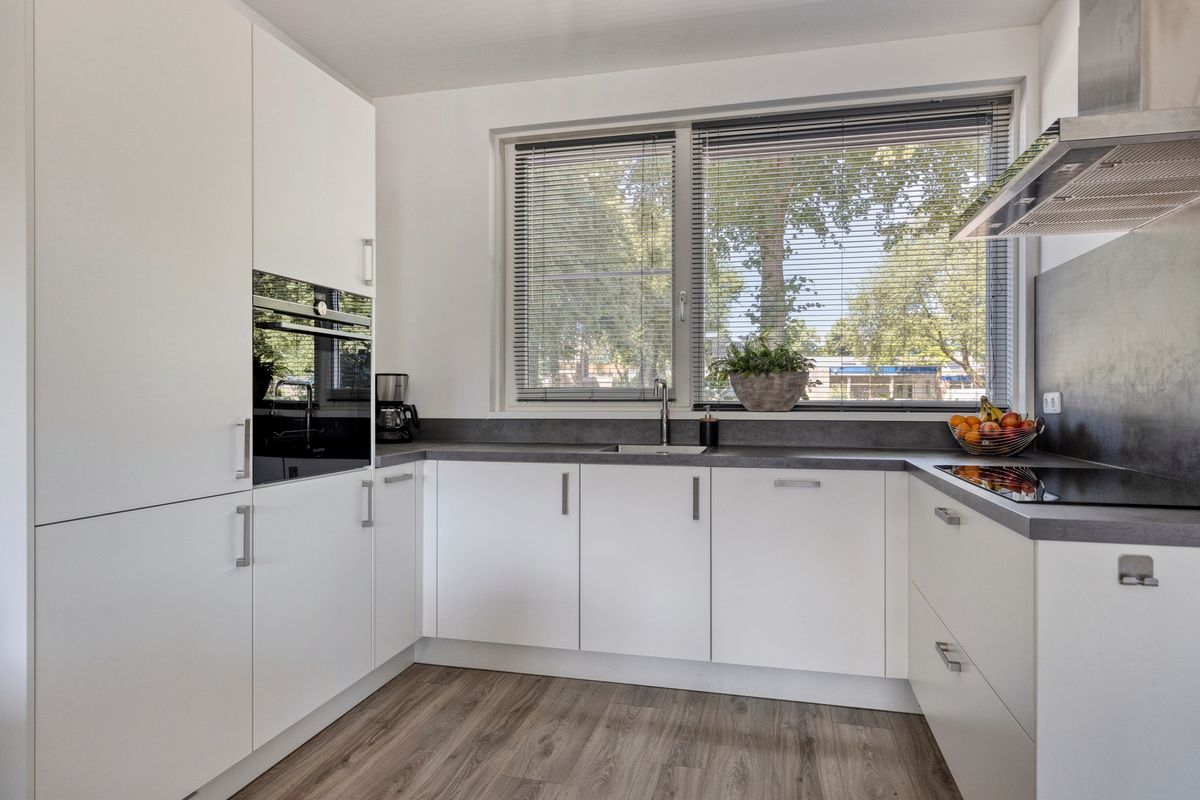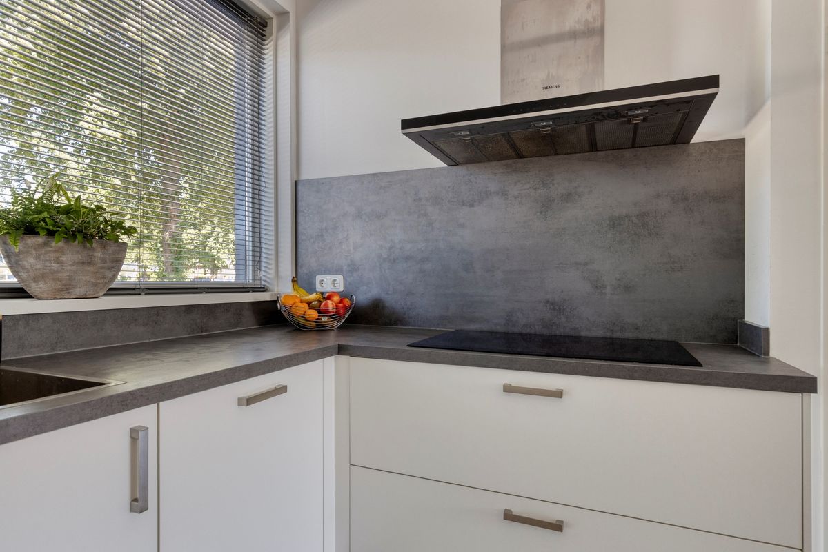 Een royale open keuken bevindt zich aan de voorzijde van de woning. De keuken is uitgevoerd in een praktische U-opstelling en biedt volop werk- en opbergruimte. Met een inductiekookplaat, afzuigkap, oven, koelkast, vaatwasser, Quooker en spoelbak is het een complete en nette keuken, waar koken een plezier wordt. Dankzij het grote raam kijkt u hier uit over de voortuin terwijl u bezig bent in de keuken.
