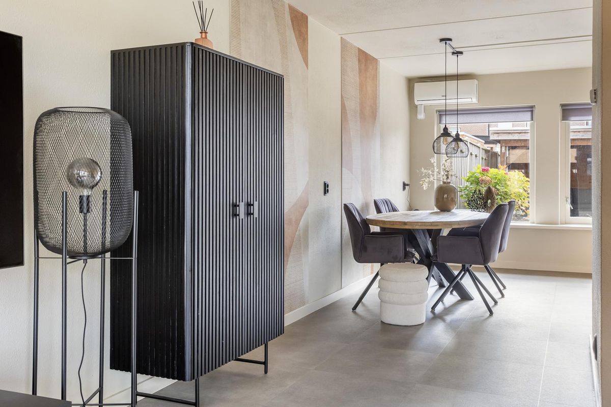 Begane grond: entree in de centrale hal met trapopgang en trapkast, meterkast, riant hangtoilet (2018) v.v. fontein, doorgang naar de U-vormige, straatgerichte en ruime woonkamer v.v. een neutrale pvc-vloer (2020), tuingericht eetgedeelte met een doorgang naar de neutrale, gerestylde inbouwkeuken met diverse inbouwapparatuur zoals een vaatwasser, gaskookplaat (2021), vlakschouw, combi- magnetron en koelkast (2023), doorgang naar de praktische bijkeuken/ aanbouw met terrasdeur en een binnendoor naar de multifunctionele garage met betonvloer en geïsoleerde wanden. Het platte dak van zowel de garage als de bijkeuken zijn in 2016 vernieuwd.