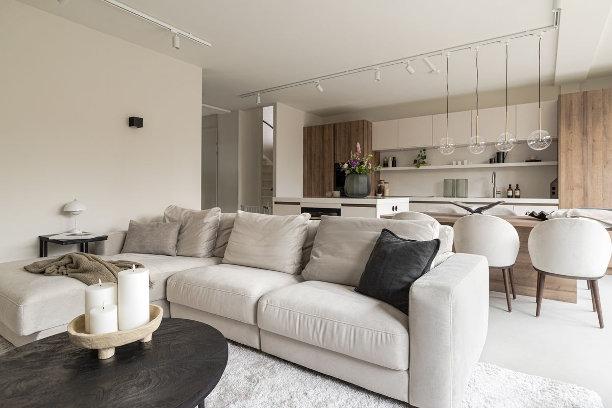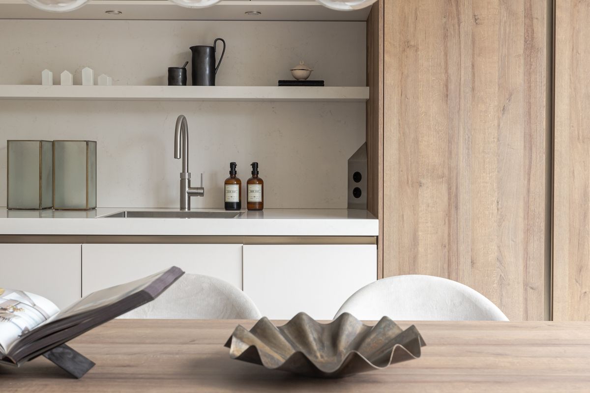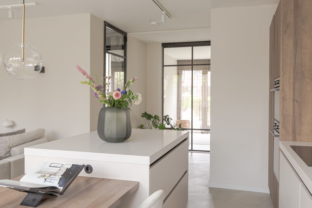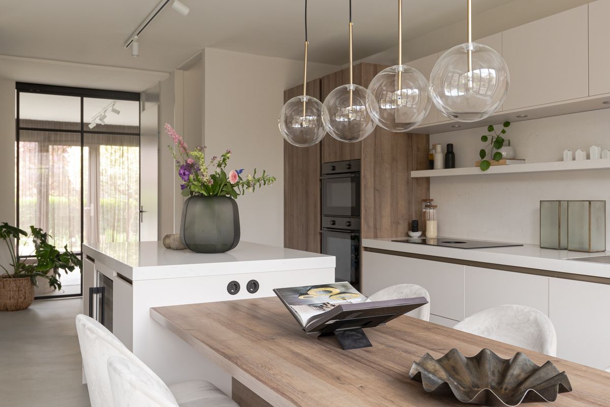De luxe open keuken vormt het hart van de woning en is uitgerust met de modernste apparatuur, waaronder een Bora inductiekookplaat met geïntegreerde afzuiging, een Quooker-kraan en een ingebouwde wijnkast. Het royale kookeiland fungeert tevens als eettafel en creëert een gezellige en praktische leefruimte.