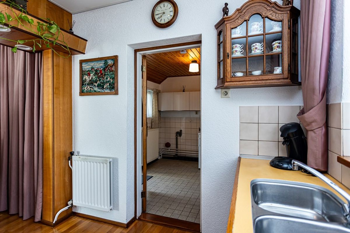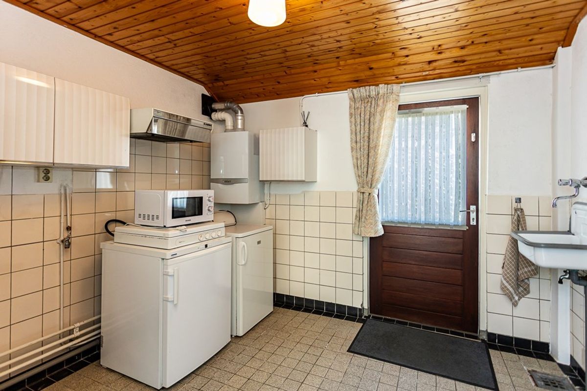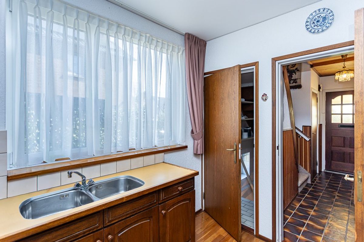 hal/entree, toilet met fontein, halfopen keuken met keukenblok in rechte opstelling, L-vorm eet-/woonkamer, bijkeuken/berging met toegang tot serre/tuinkamer.