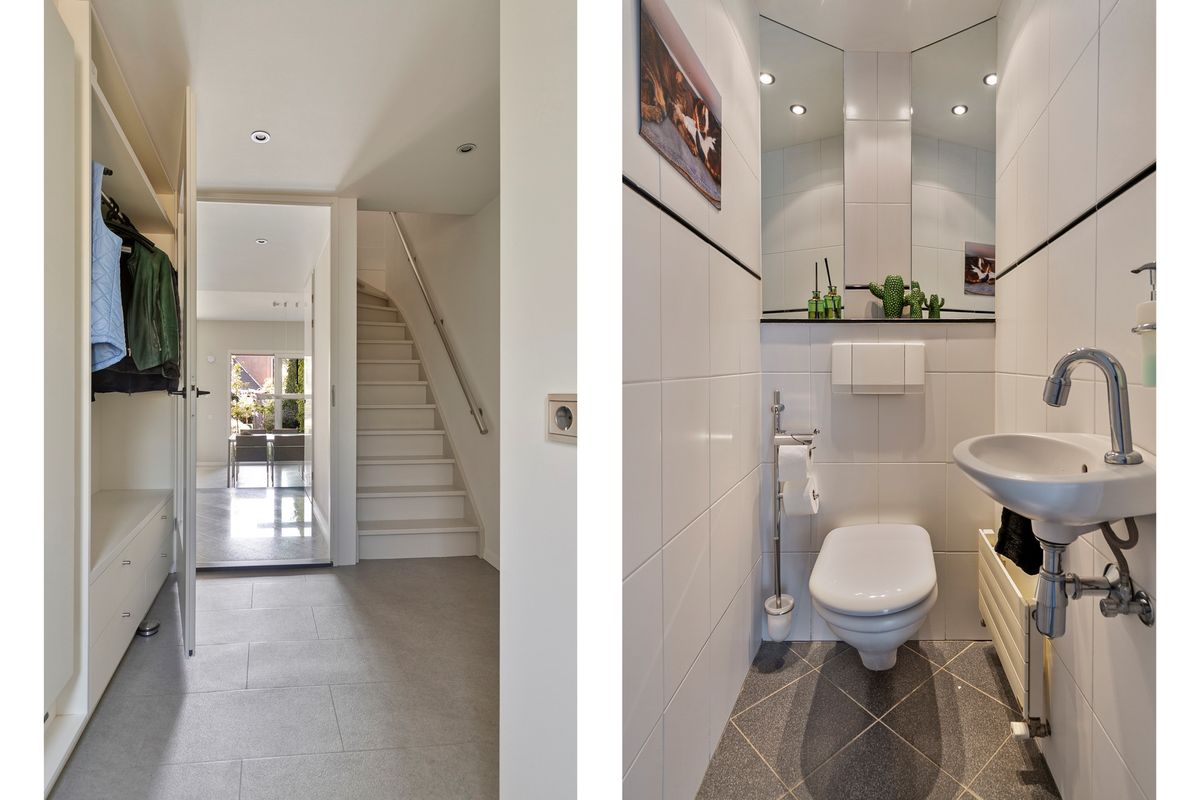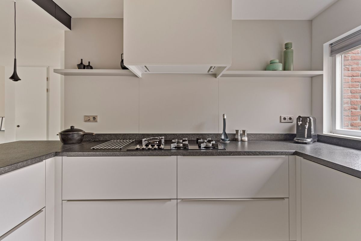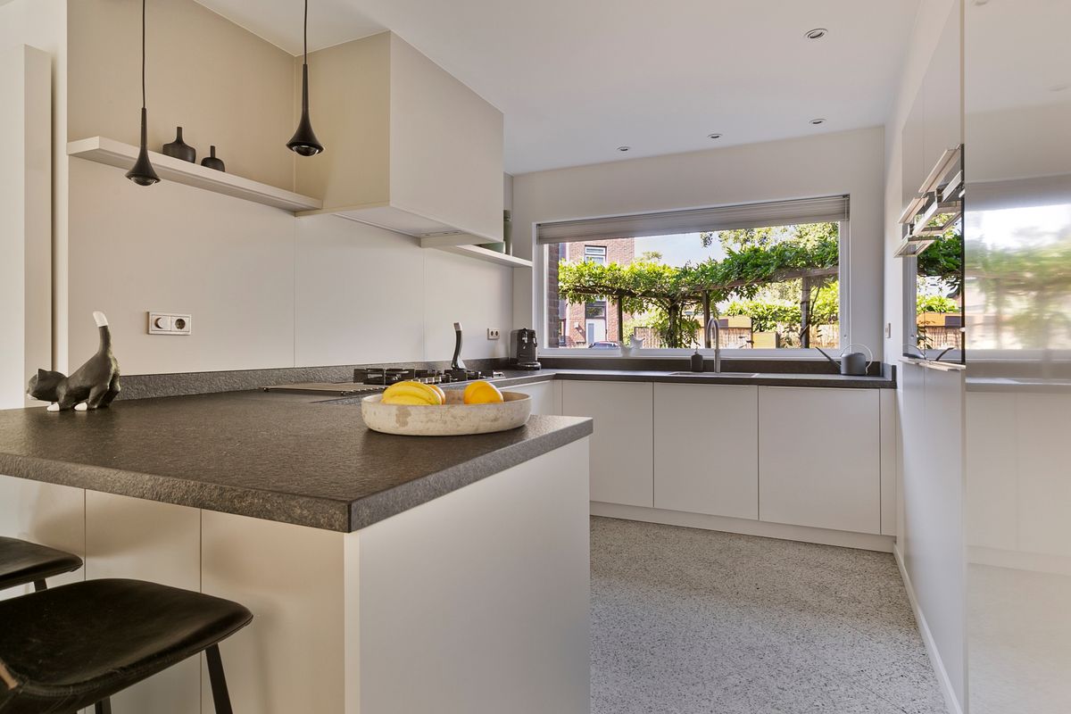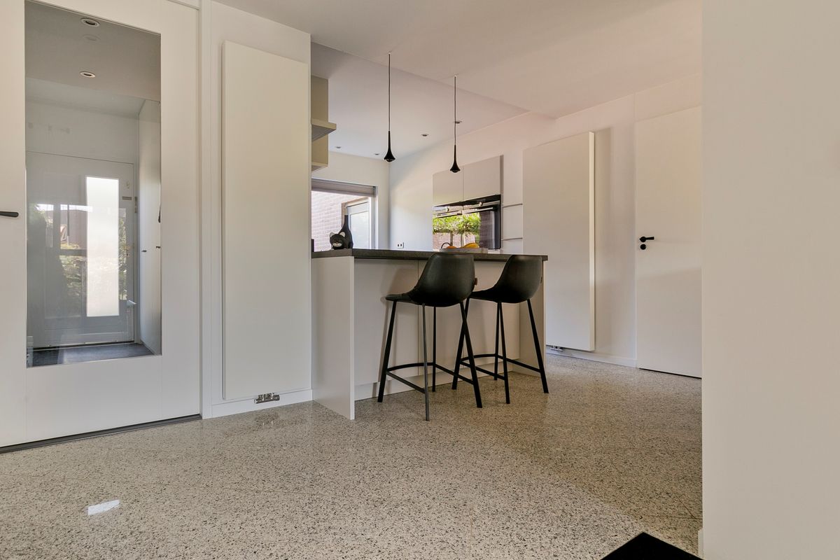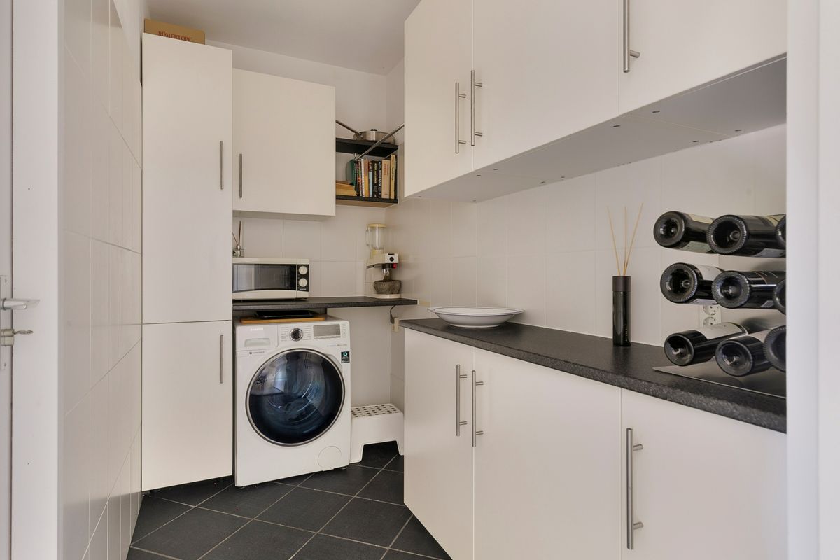 De keuken is slechts vijf jaar oud en heeft een opstelling met een separate apparatenwand. Het geheel is afgewerkt met een granieten werkblad. De keuken is uitgerust met diverse inbouwapparatuur, waaronder een 5-pits kookplaat met wokbrander, een vaatwasmachine, een combi-/stoomoven, een combioven, een koelkast én een Quooker. Grenzend aan de keuken bevindt zich de praktische bijkeuken, die veel bergruimte biedt en waar de opstelplaatsen voor de wasmachine en droger zijn gesitueerd. De bijkeuken staat in verbinding met de inpandige garage. Deze is momenteel in gebruik als berging met een deur naar de voortuin, maar is eenvoudig weer terug te brengen naar de oorspronkelijke functie als garage. Op de begane grond ligt een prachtige granieten vloer met deels vloerverwarming.