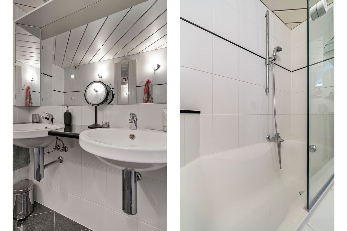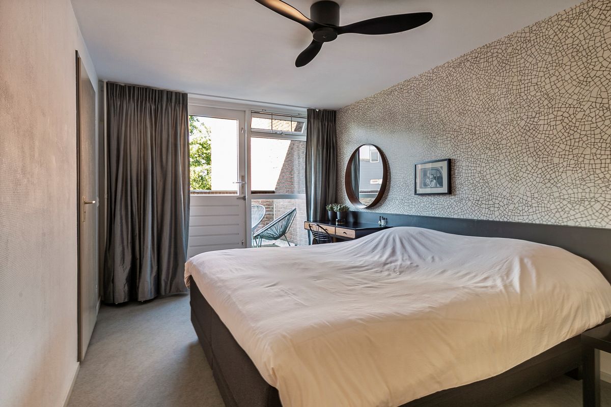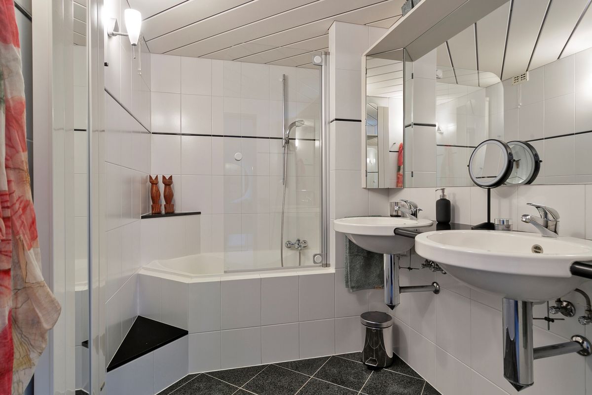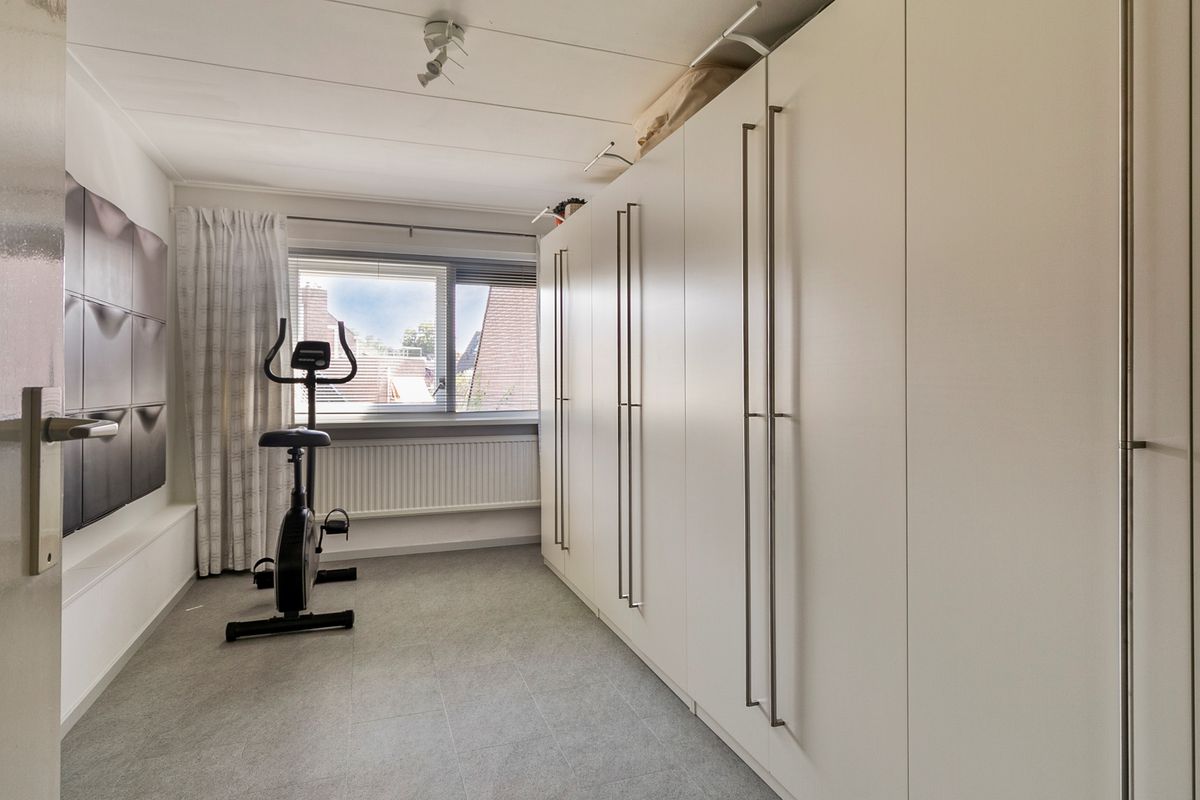 De ruime overloop op de eerste verdieping biedt toegang tot een separaat toilet en de tweede badkamer, welke is voorzien van een douche en een wastafelmeubel. Op deze verdieping bevinden zich vier kamers. Twee kamers liggen aan de achterzijde en twee aan de voorzijde. De grootste kamer aan de voorzijde is in gebruik als ouderslaapkamer en beschikt over een deur naar het balkon én een eigen badkamer met een ligbad en een wastafelmeubel. De vierde kamer is de open videkamer. Vanuit deze ruimte is er zicht op de woonkamer, waardoor de kamer perfect dienst kan doen als werk- of hobbyruimte. Op de gehele verdieping ligt een pvc vloer.