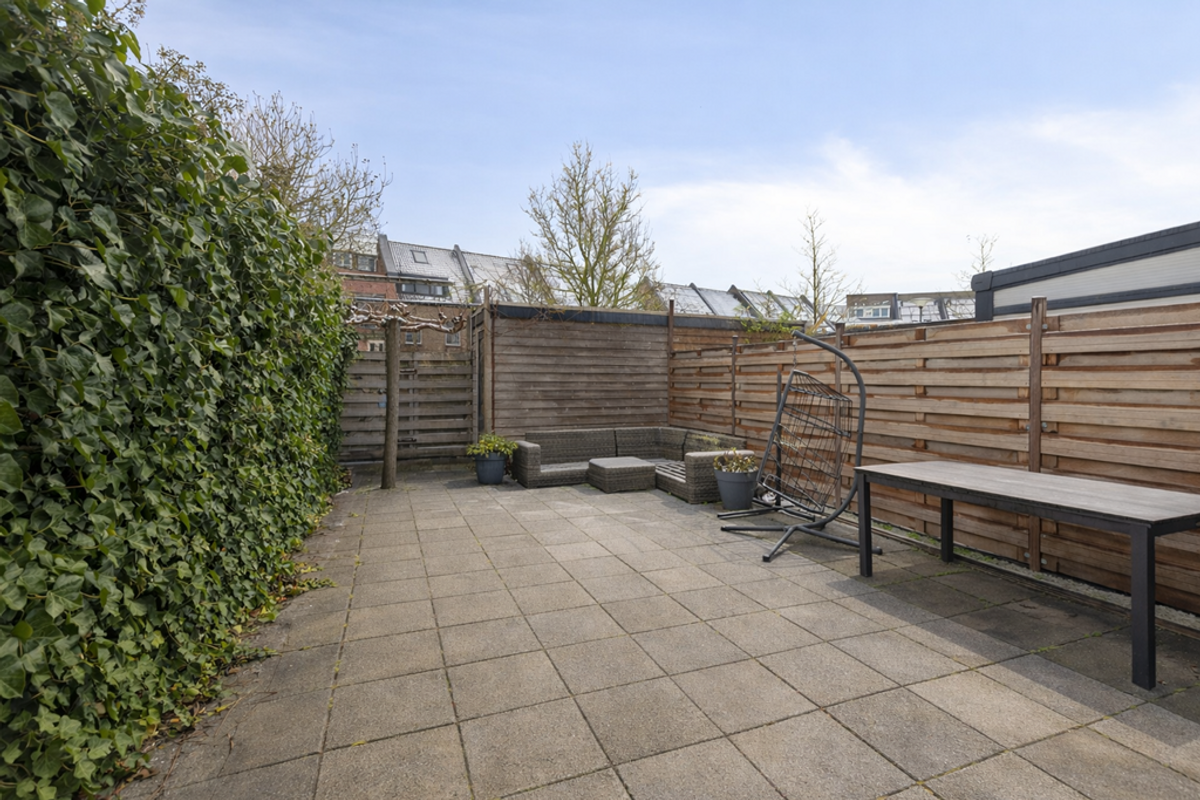 De achtertuin is gelegen op het noorden en biedt een rustige, lichte buitenruimte. Daarnaast is er een praktische, vrijstaande houten berging aanwezig, ideaal voor het opbergen van tuinspullen en fietsen.