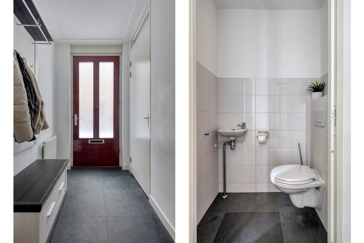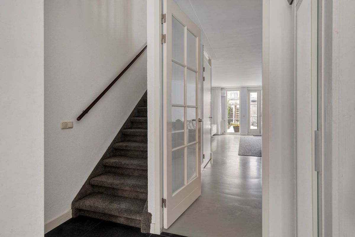 Via de entree betreedt u de hal met een open trap, een uitgebreide meterkast (10 groepen en 3 aardlekschakelaars) en een zwevend toilet met fonteintje.