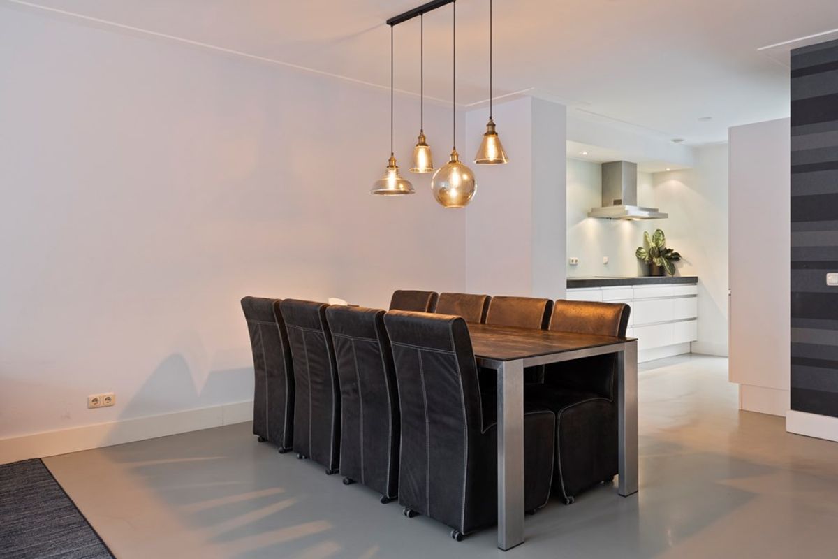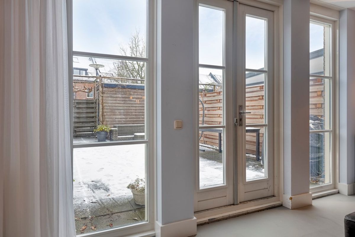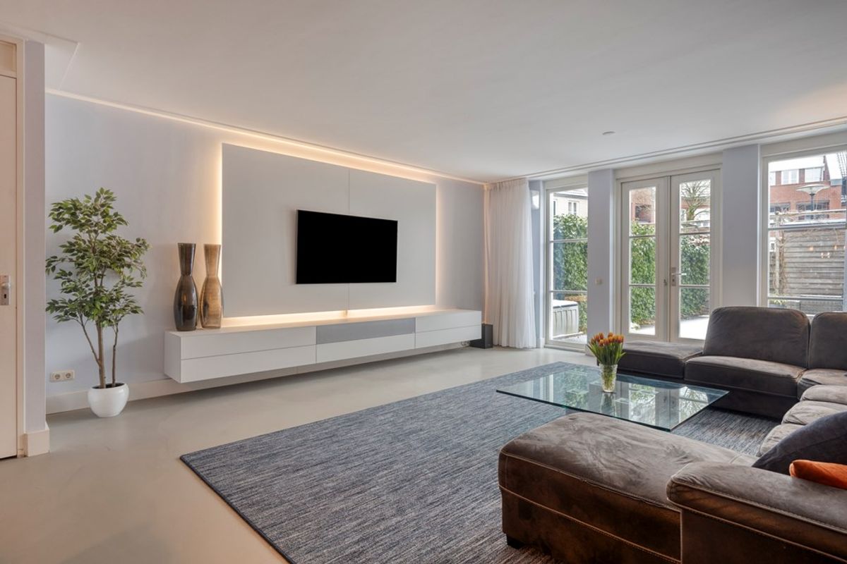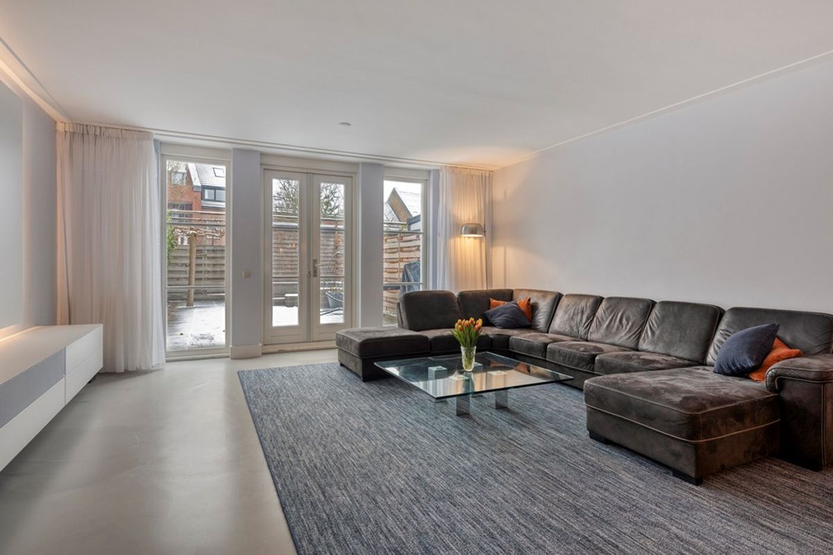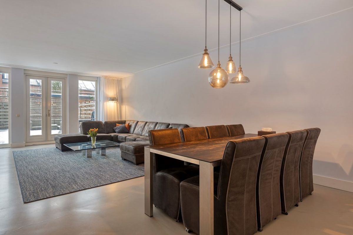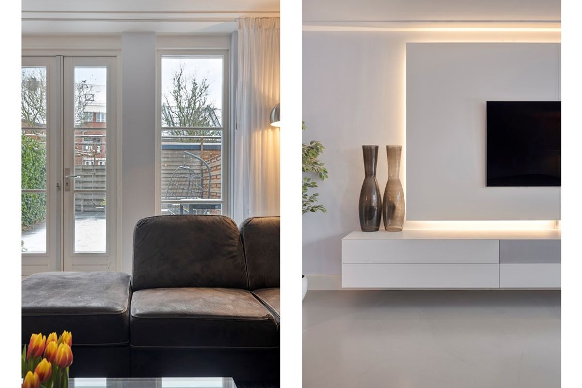 De riante, tuingerichte uitgebouwde woonkamer is voorzien van openslaande deuren naar de achtertuin. De gehele woonkamer heeft strakke wanden, een plafond met Amsterdamse plinten, een gietvloer en airconditioning, wat het geheel een moderne en sfeervolle uitstraling geeft.