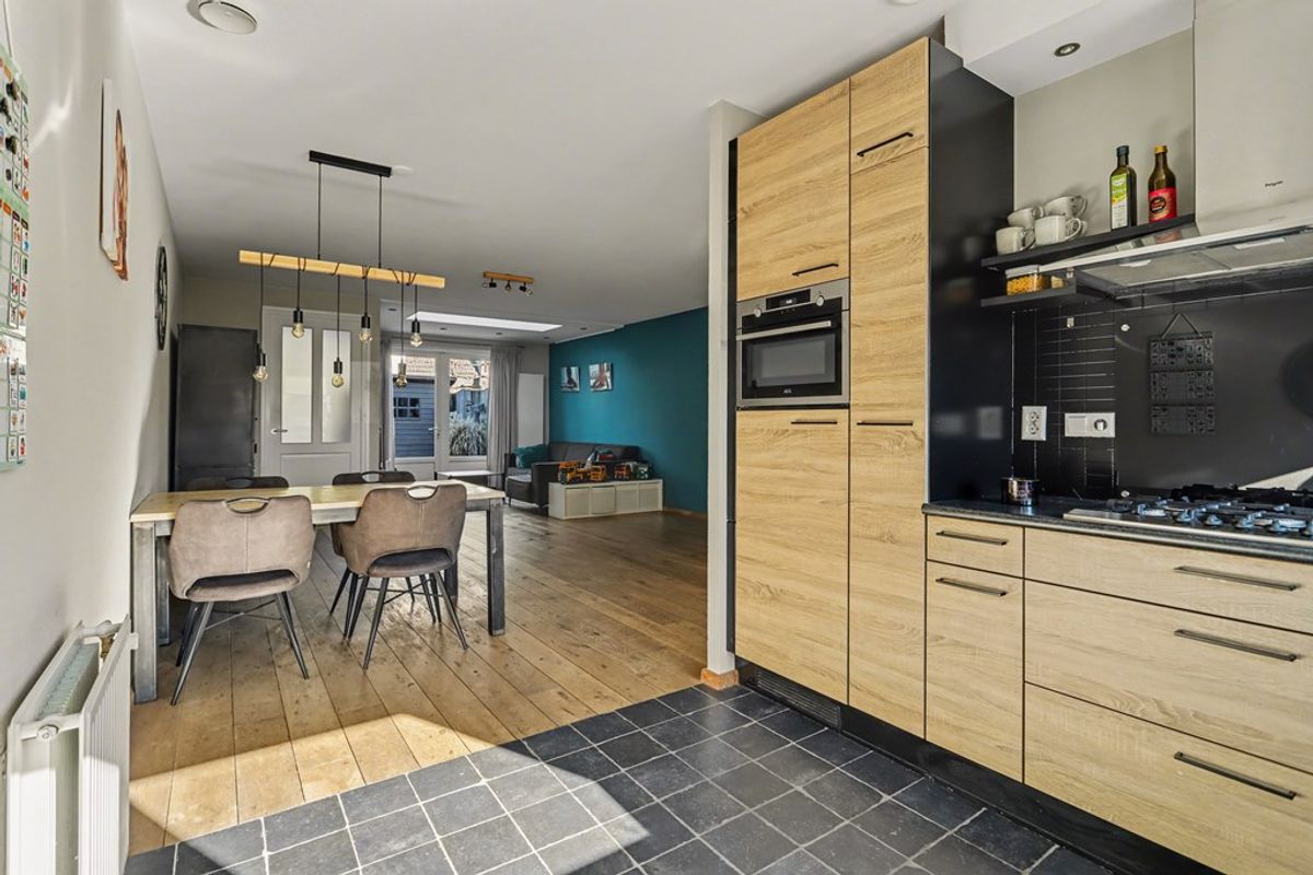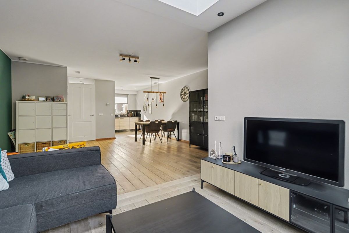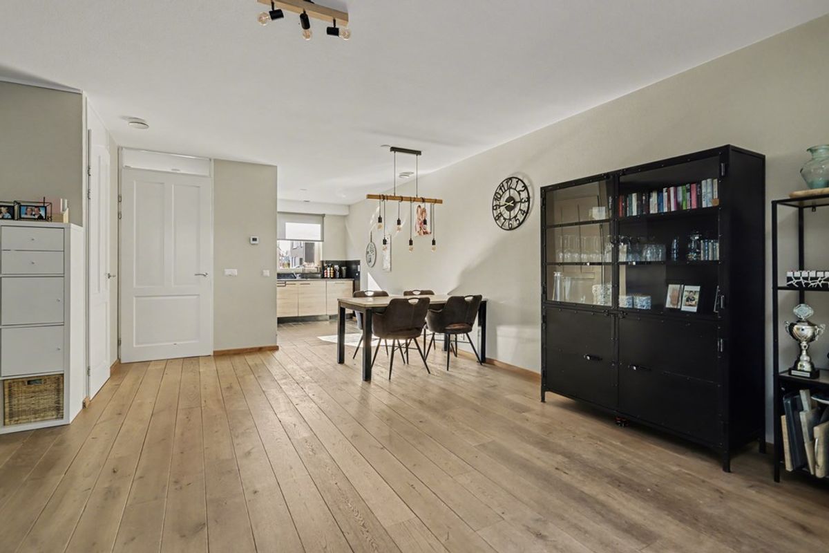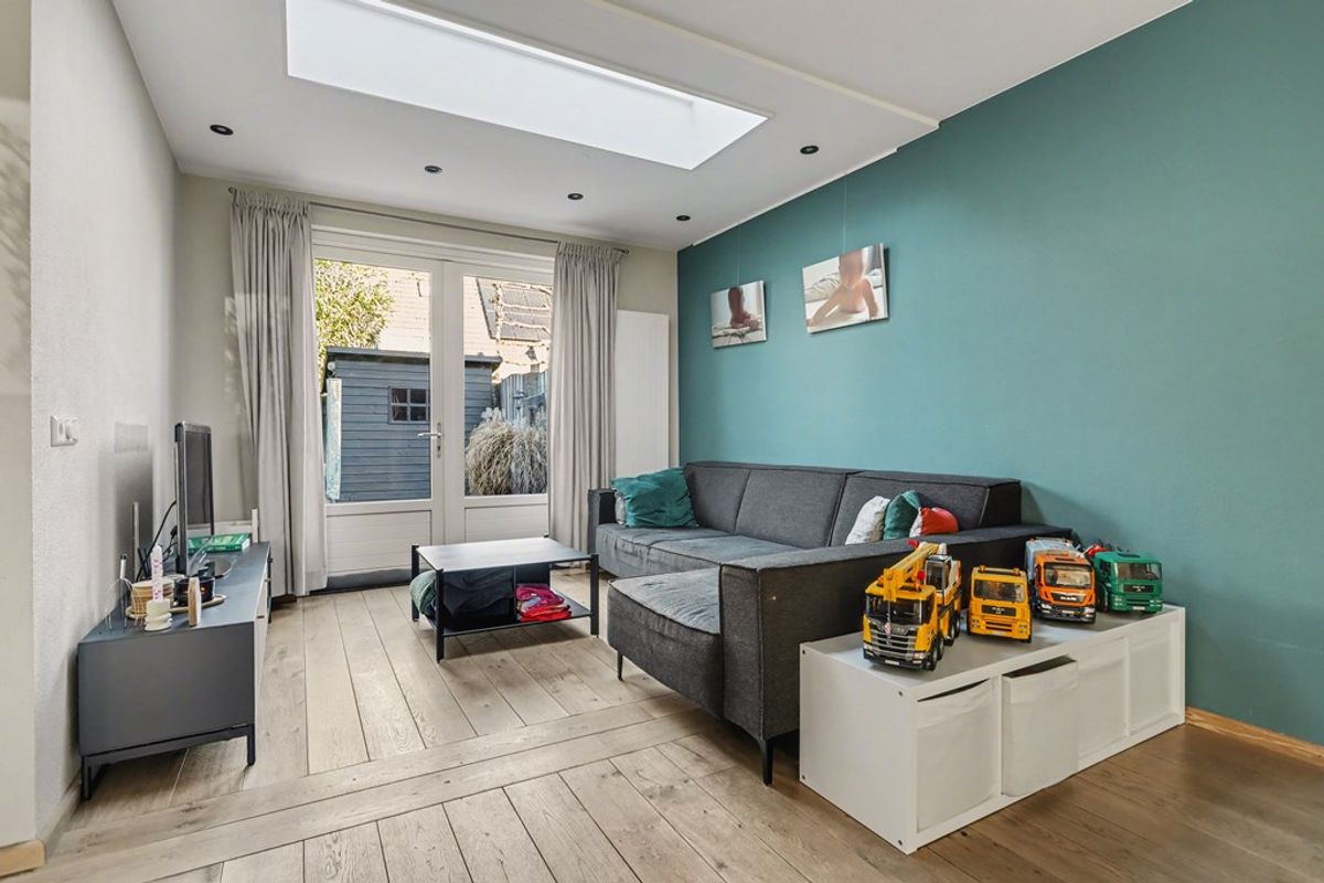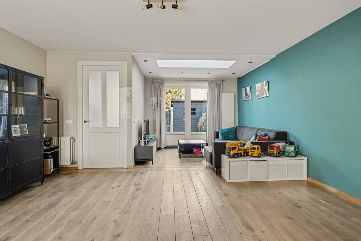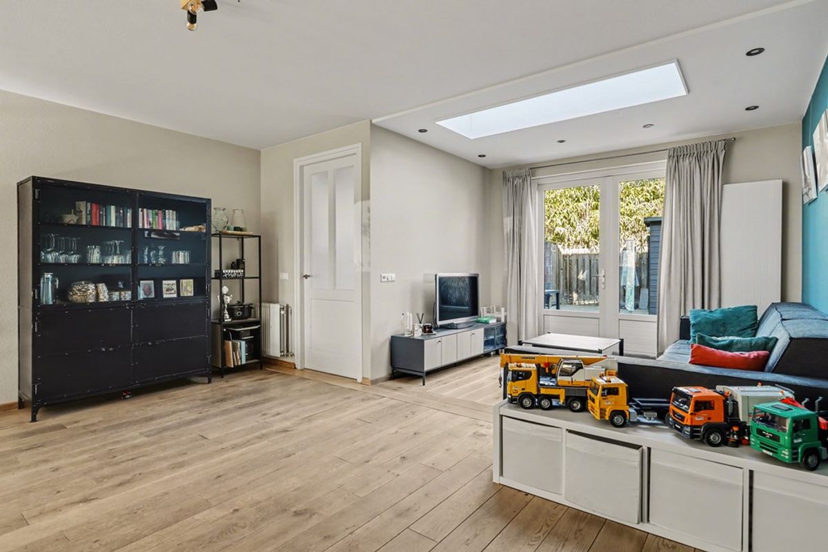De uitgebouwde woonkamer is tuingericht en biedt dankzij de lichtstraat een prettige hoeveelheid daglicht. De tuindeuren zorgen voor een fijne verbinding met de achtertuin. De woonkamer is afgewerkt met een fraaie eikenhouten vloer. Onder de trap bevindt zich een praktische en ruime provisiekast.