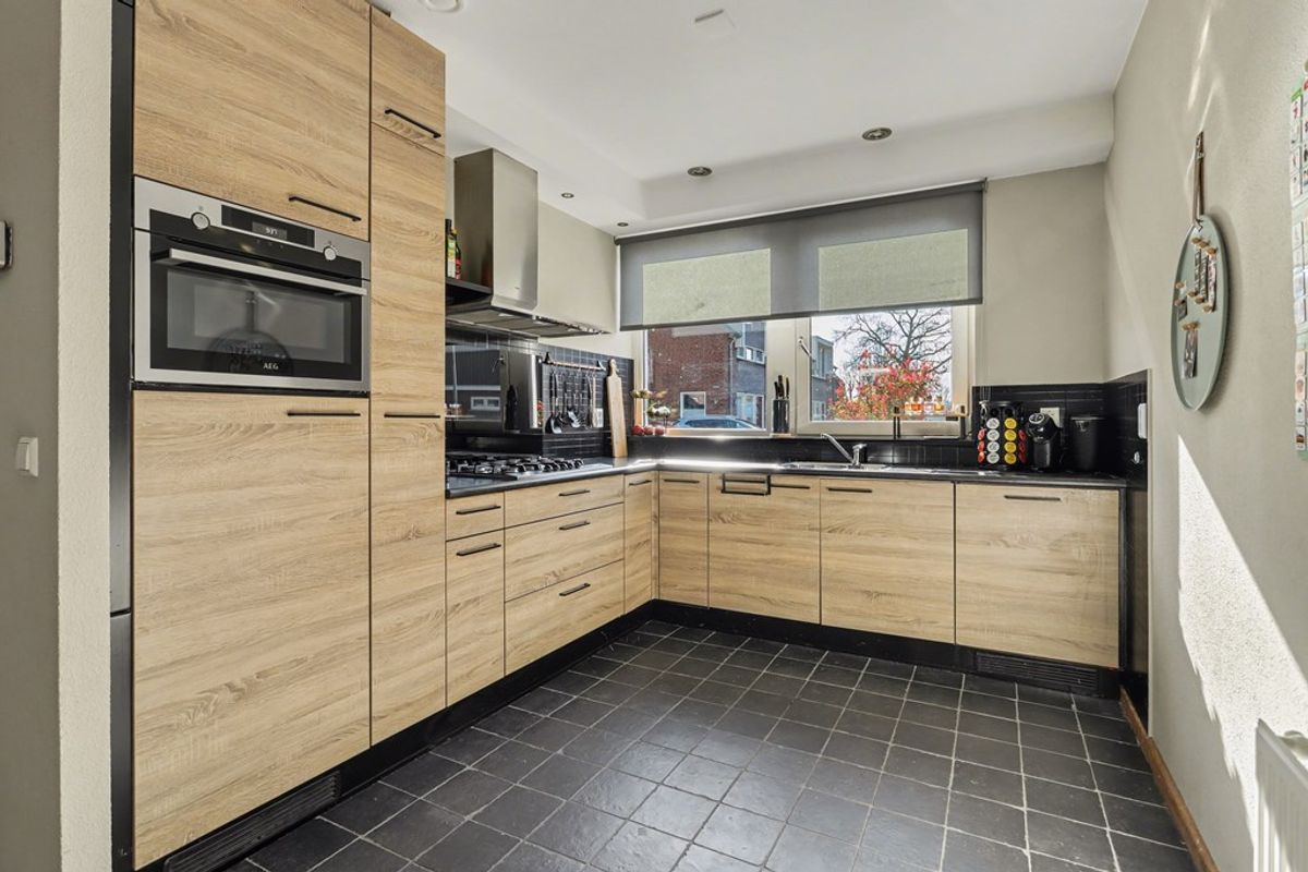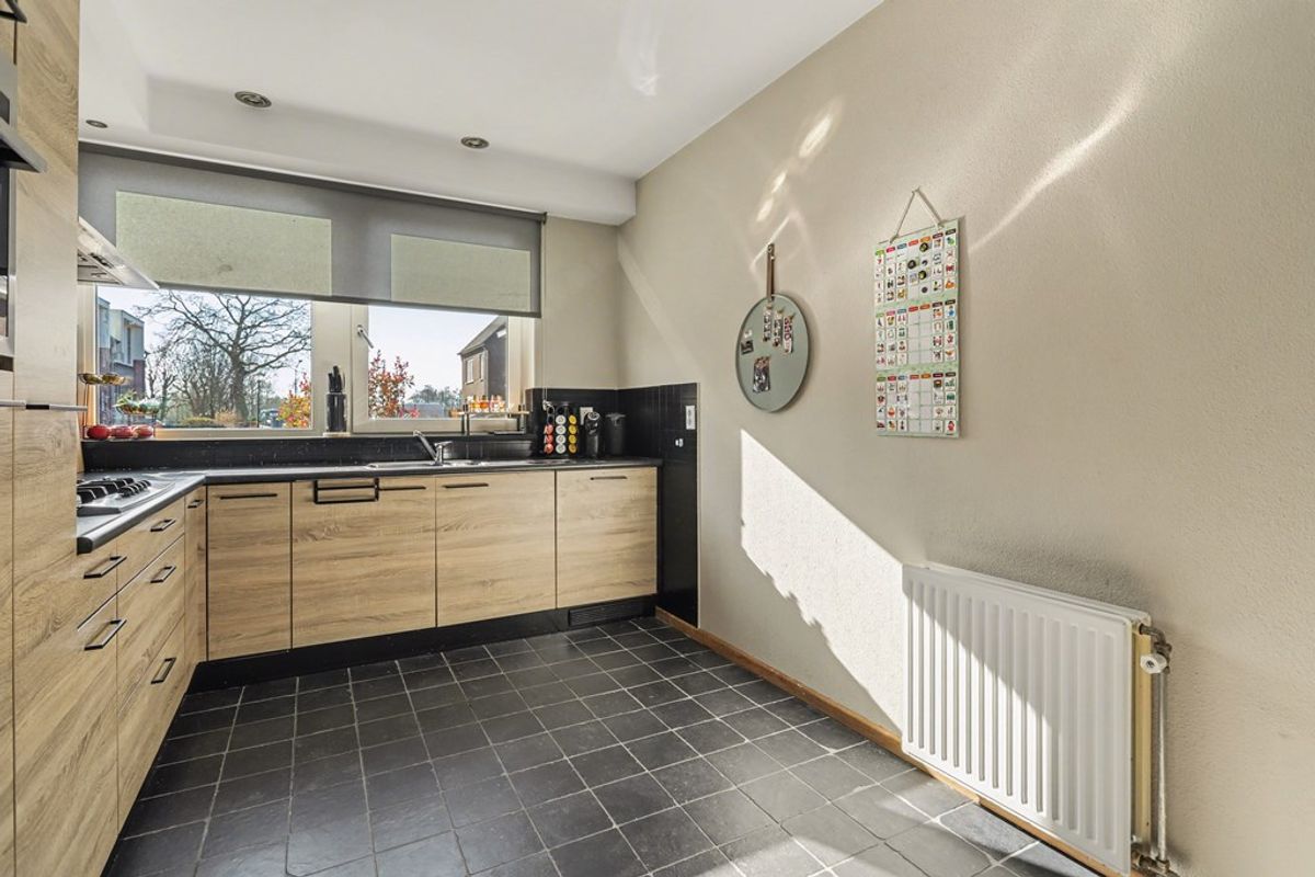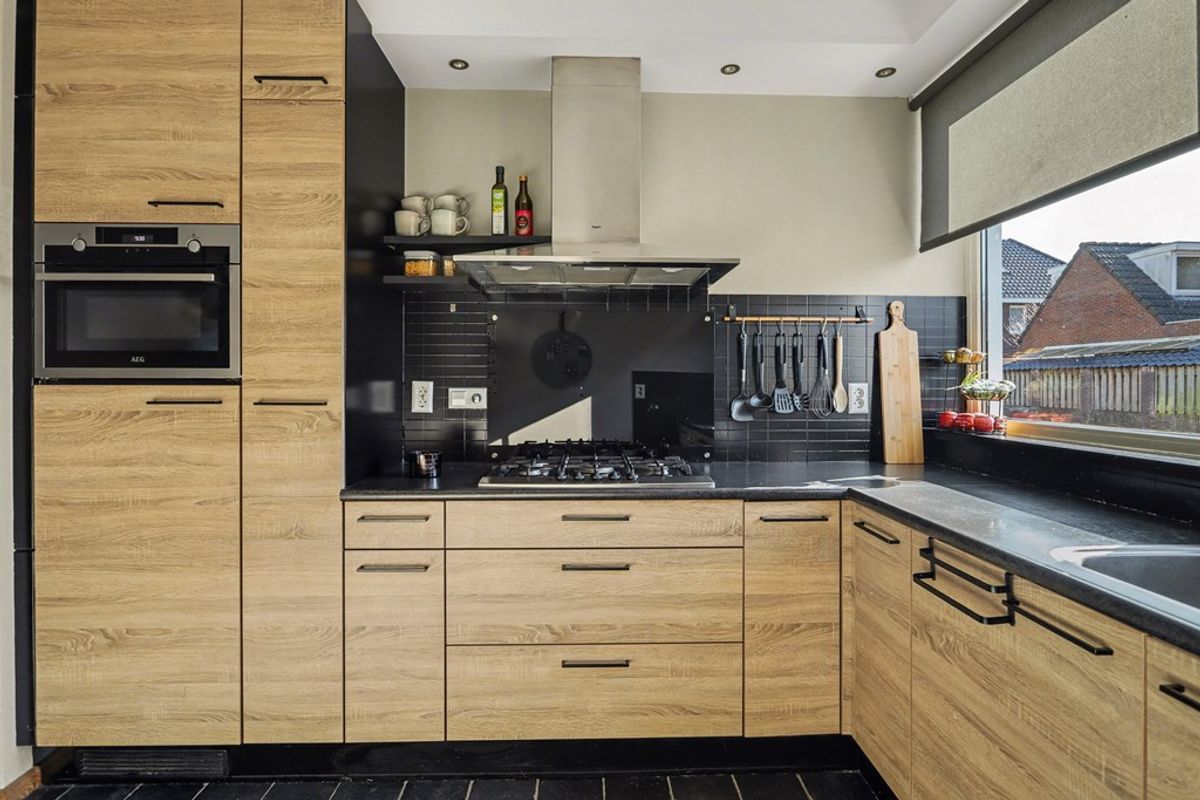 De open keuken in hoekopstelling heeft een lichte uitstraling en is voorzien van diverse inbouwapparatuur, waaronder een 5-pits gaskookplaat, afzuigkap, combimagnetron en vaatwasser. De keuken is afgewerkt met inbouwspots en een tegelvloer.