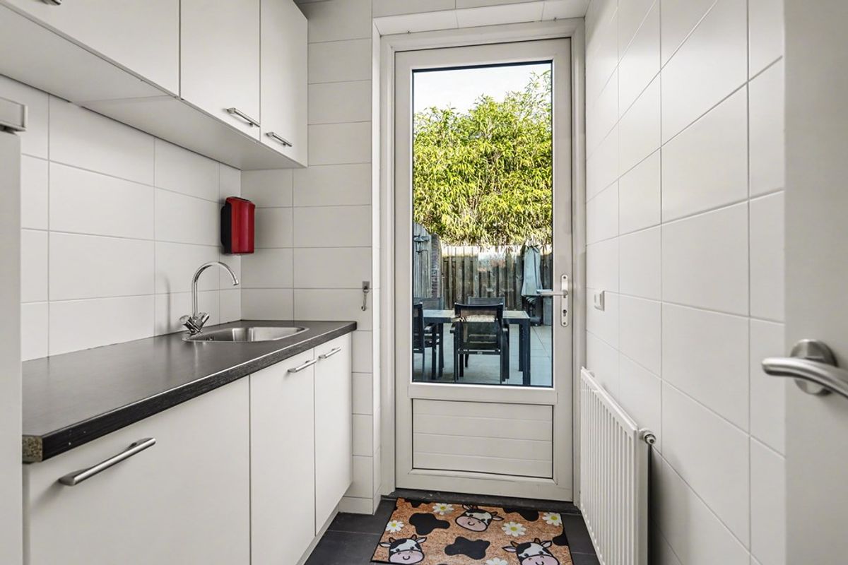 Vanuit de woonkamer bereikbaar. Praktische ruimte met keukenblok en spoelbak met close-inboiler, ideaal voor extra opslag en gebruiksgemak.