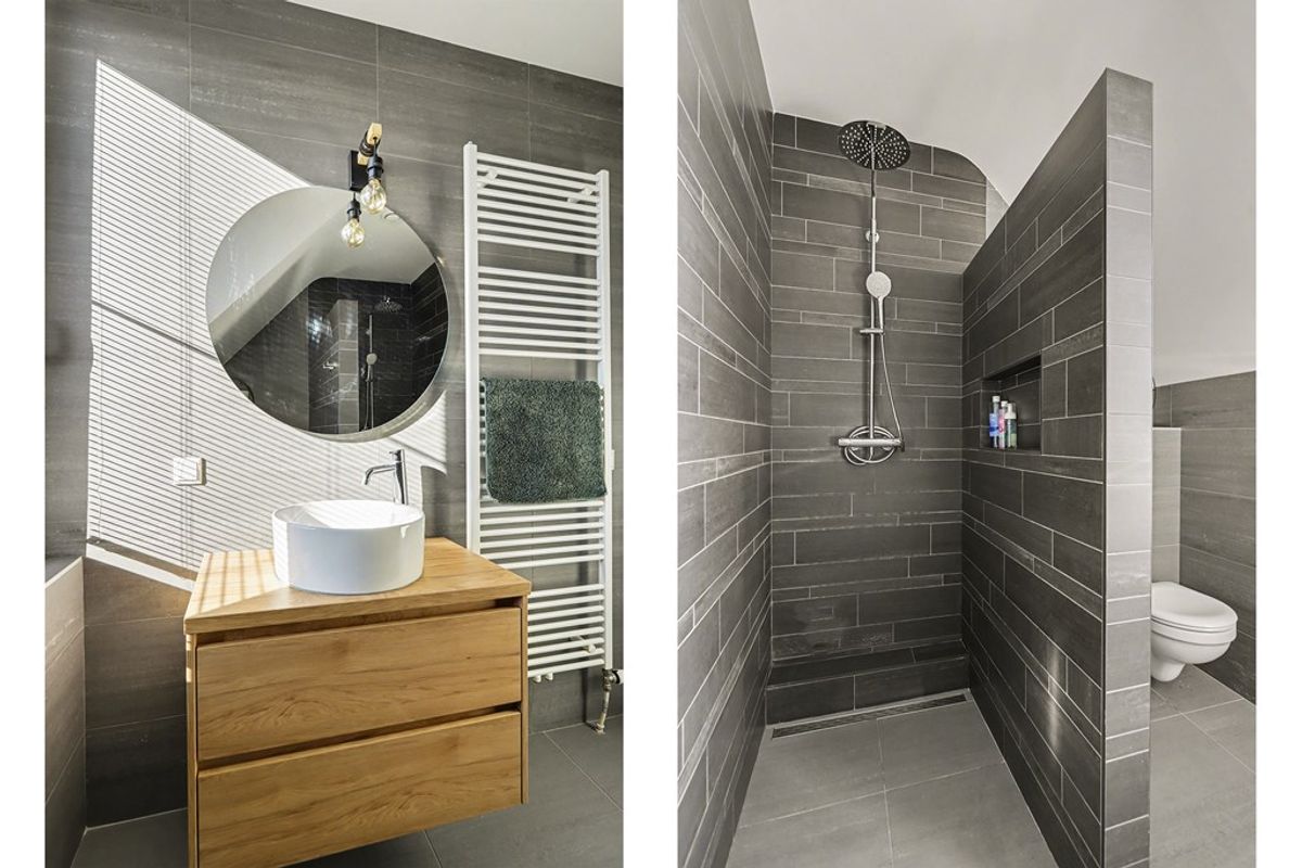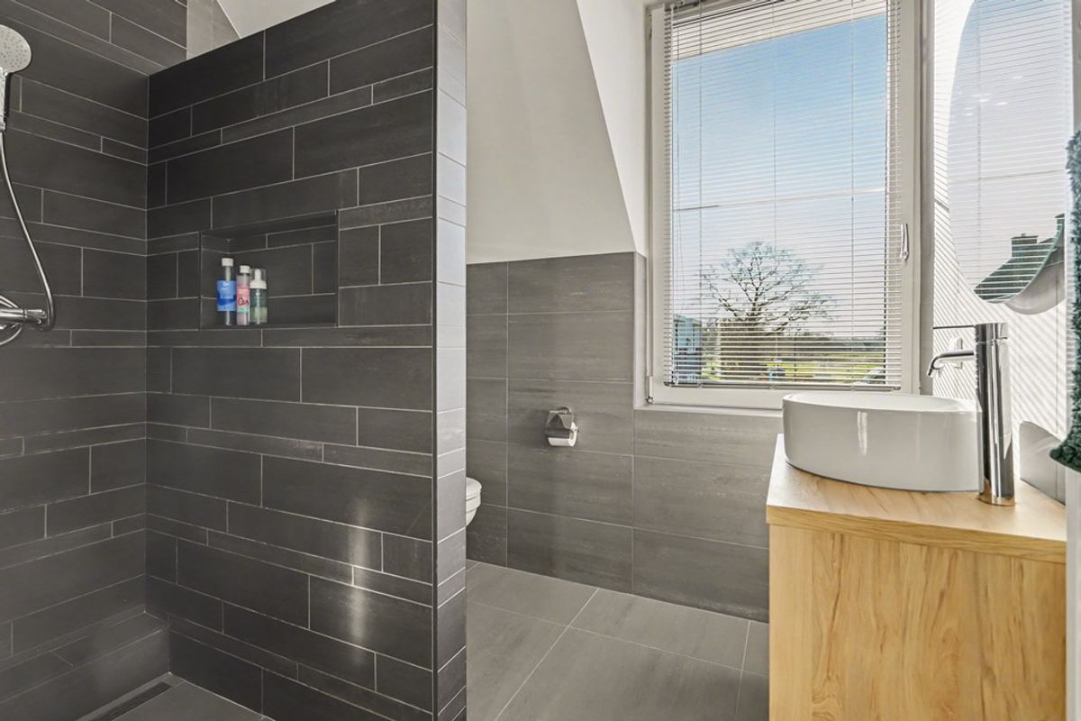 Ruime en complete badkamer voorzien van inloopdouche, hangend toilet en een wastafelmeubel.
