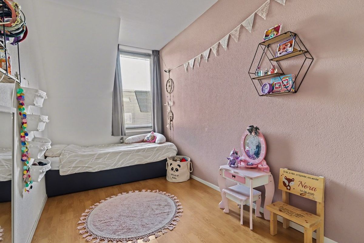 De overloop geeft toegang tot drie slaapkamers van circa 10 m², 11 m² en 12 m². De gehele verdieping is afgewerkt met een laminaatvloer.