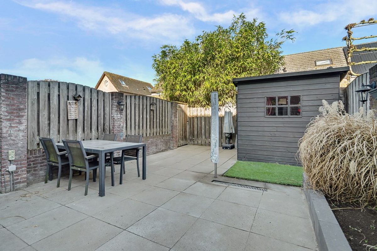 De onderhoudsvriendelijke achtertuin beschikt over een houten vrijstaande berging en een eigen achterom.