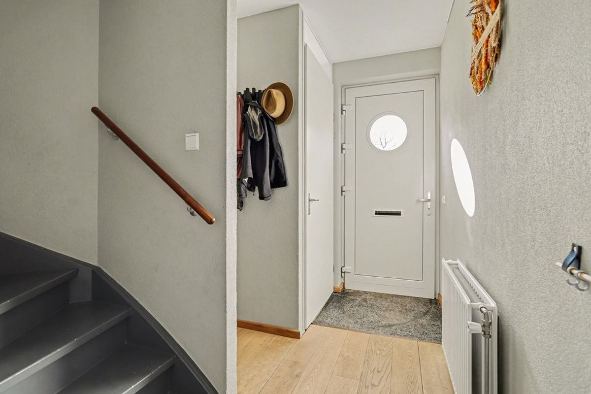 De hal biedt toegang tot de woonkamer, het toilet en de trapopgang naar de eerste verdieping. Bij de meterkast is ruimte voor een garderobe. Het geheel betegelde toilet is ruim van opzet en voorzien van een hangcloset en fonteintje.