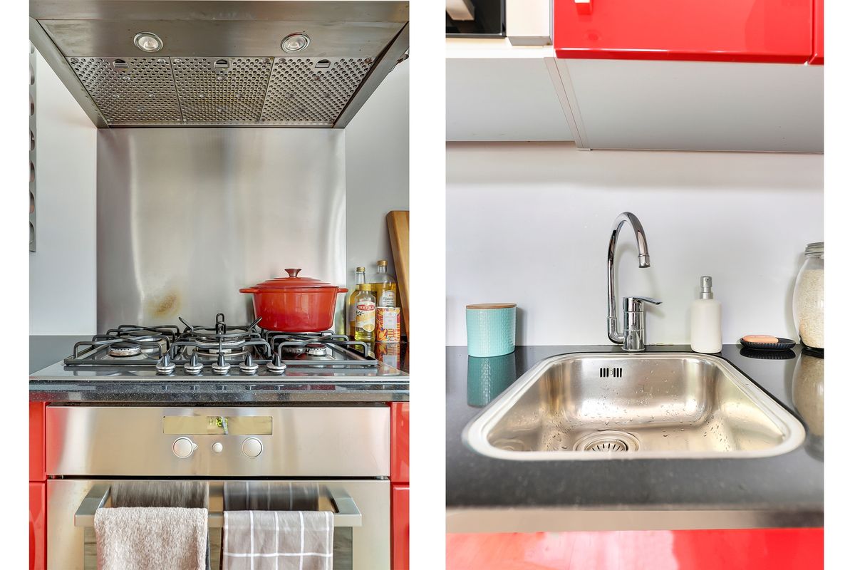 De nette L-vormig open keuken is voorzien van granito aanrechtblad, diverse inbouwapparatuur zoals een 5 pits gas kookplaat, afzuigkap, een hete lucht oven, een magnetron en een vaatwasser. Vanuit de keuken eveneens toegang tot het achterbalkon.