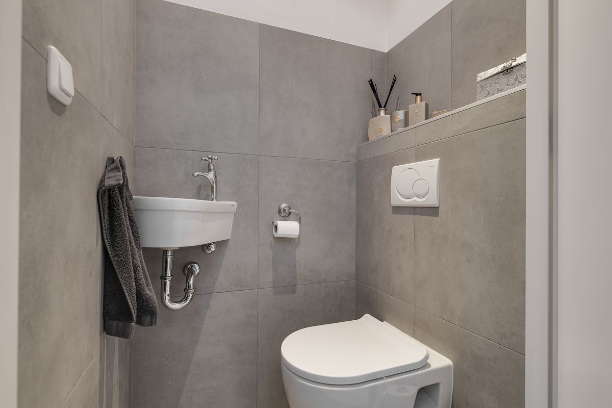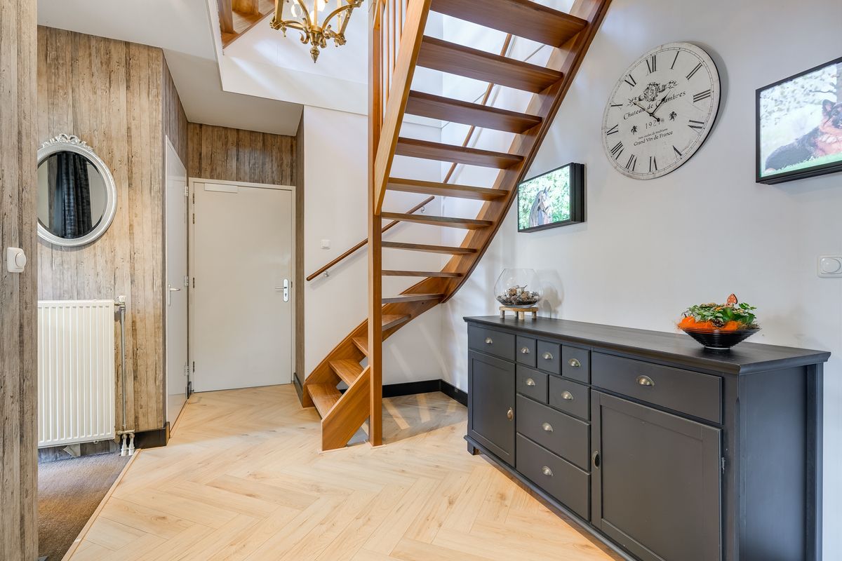 Spacious entrance with cloakroom, toilet and staircase. The living room is bright and inviting with large windows, a wood or gas fireplace and French doors to the garden. The open kitchen is fully equipped with top-quality appliances and overlooks the garden.