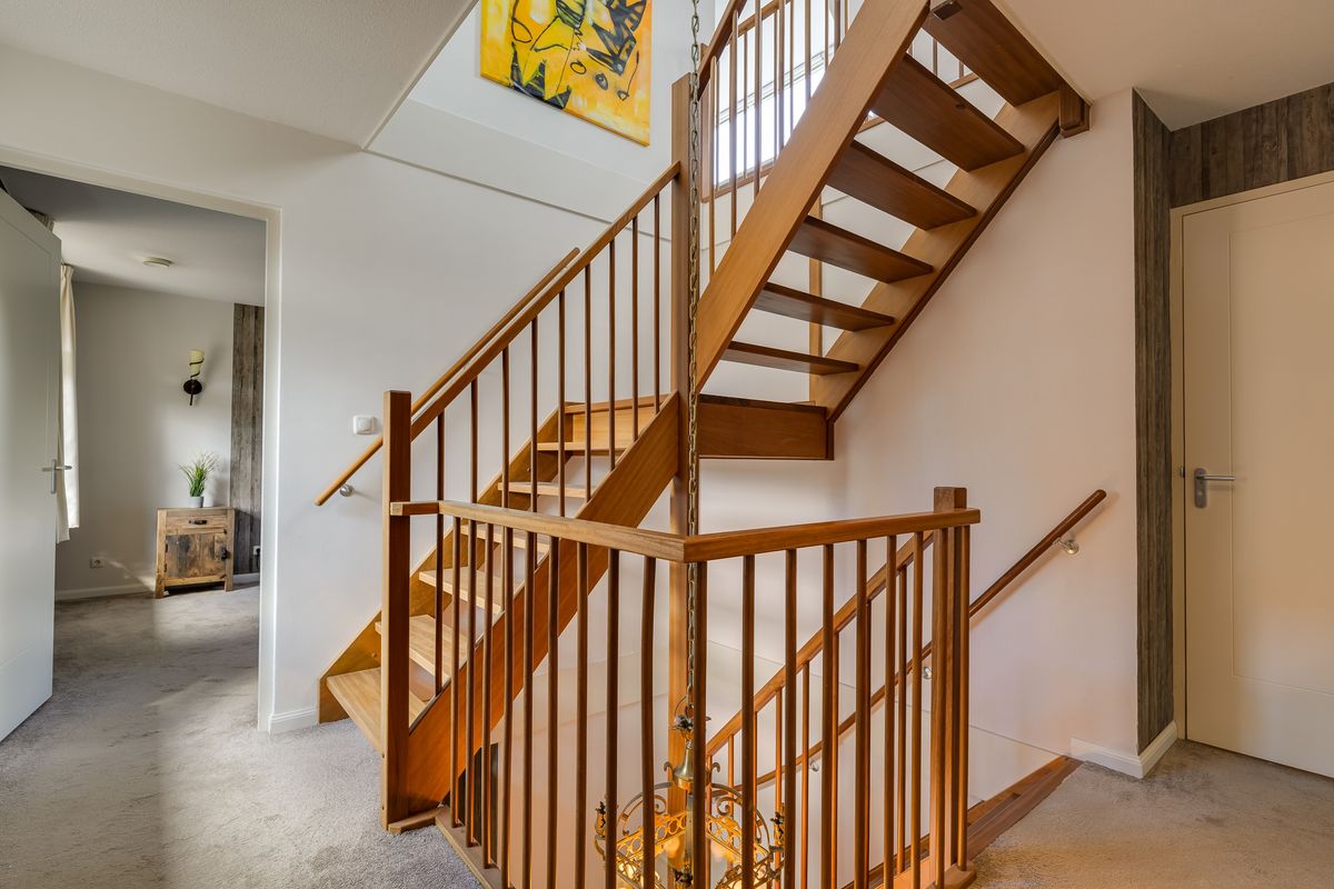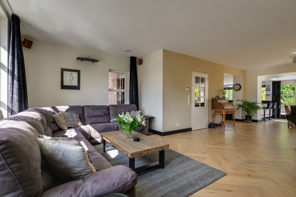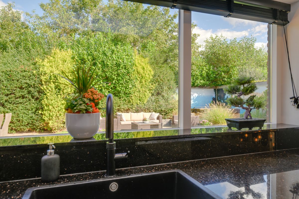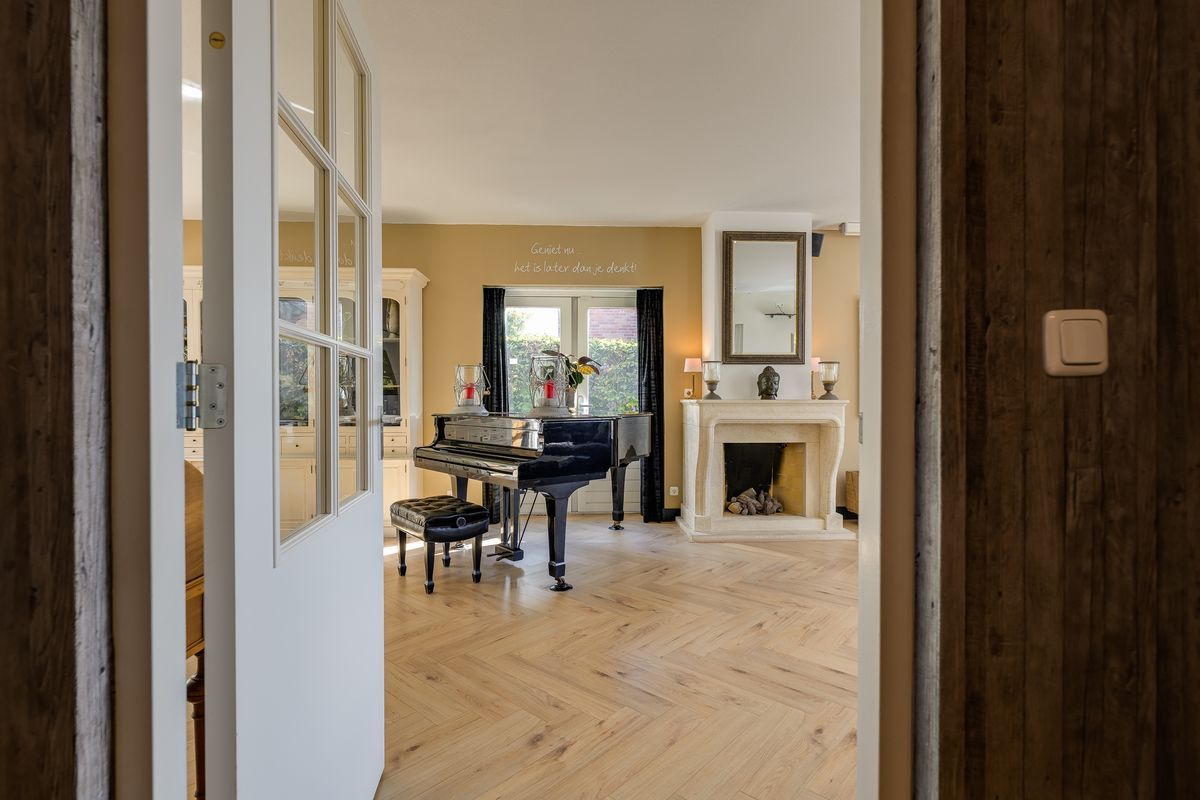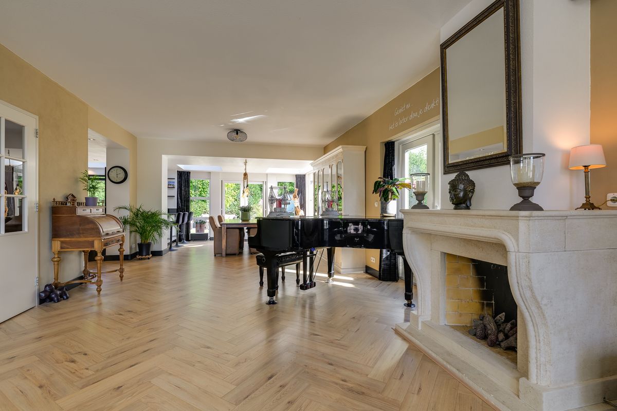 Via de ruime entree kom je in de lichte hal met modern toilet, garderobe en trapopgang. De woonkamer is een echte eyecatcher: een royale leefruimte met sfeervolle haard (hout of gas), grote raampartijen, openslaande deuren naar de tuin en een elektrisch screen. De open keuken is luxe uitgevoerd en van alle gemakken voorzien: twee koelkasten, een vriezer, quooker, inductie kookplaat, oven, magnetron en vaatwasser. Vanuit de keuken kijk je uit op de tuin, die perfect aansluit bij het gezinsleven.