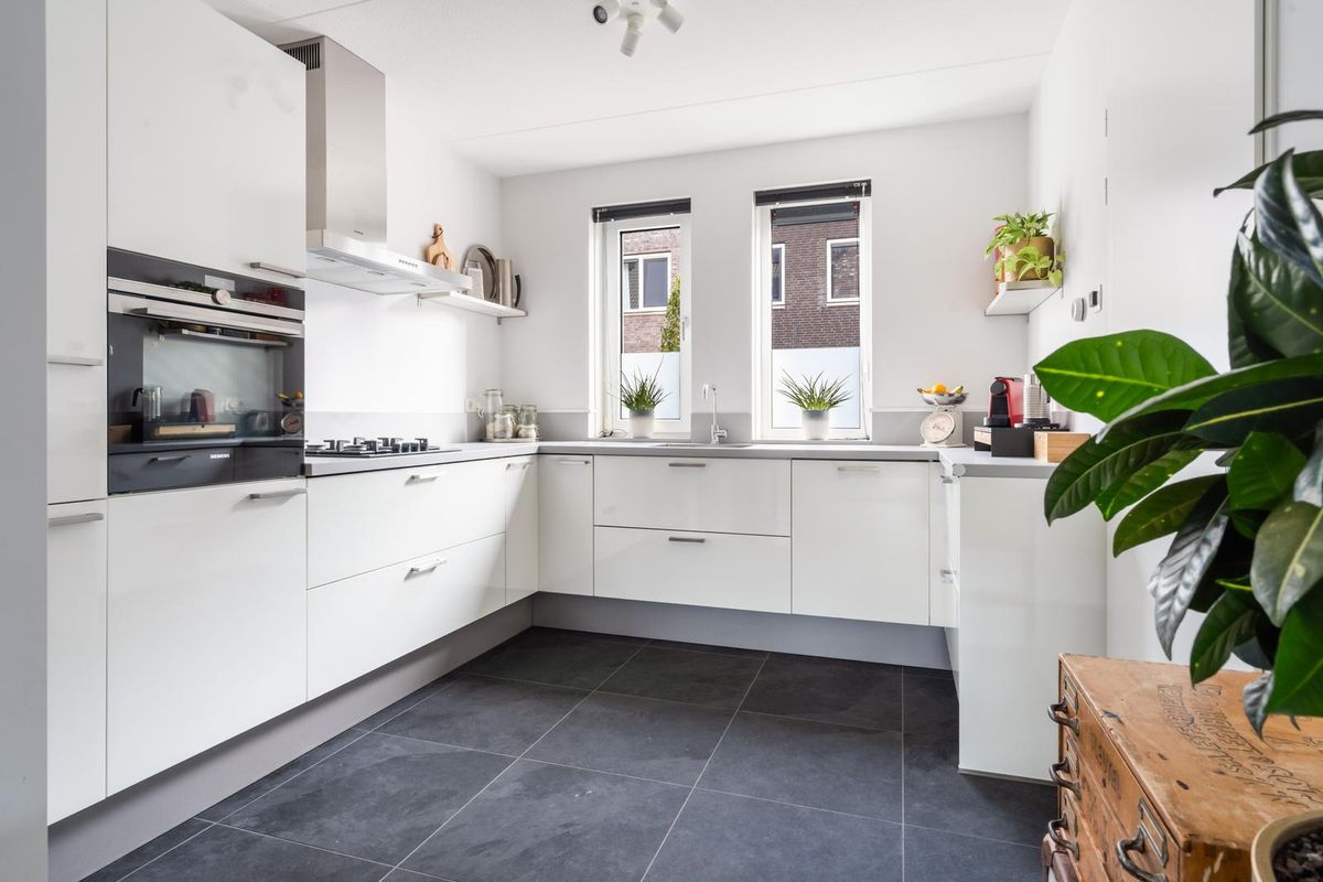 Aan de voorzijde bevindt zich de open keuken in hoekopstelling, voorzien van hoogwaardige inbouwapparatuur zoals een Siemens (stoom)oven, gaskookplaat, vaatwasser en koel-/vrieskast. Onder de trap is een praktische bergkast gecreëerd. Aan de voorzijde van de woning elektrisch bedienbare screens als zonnewering.