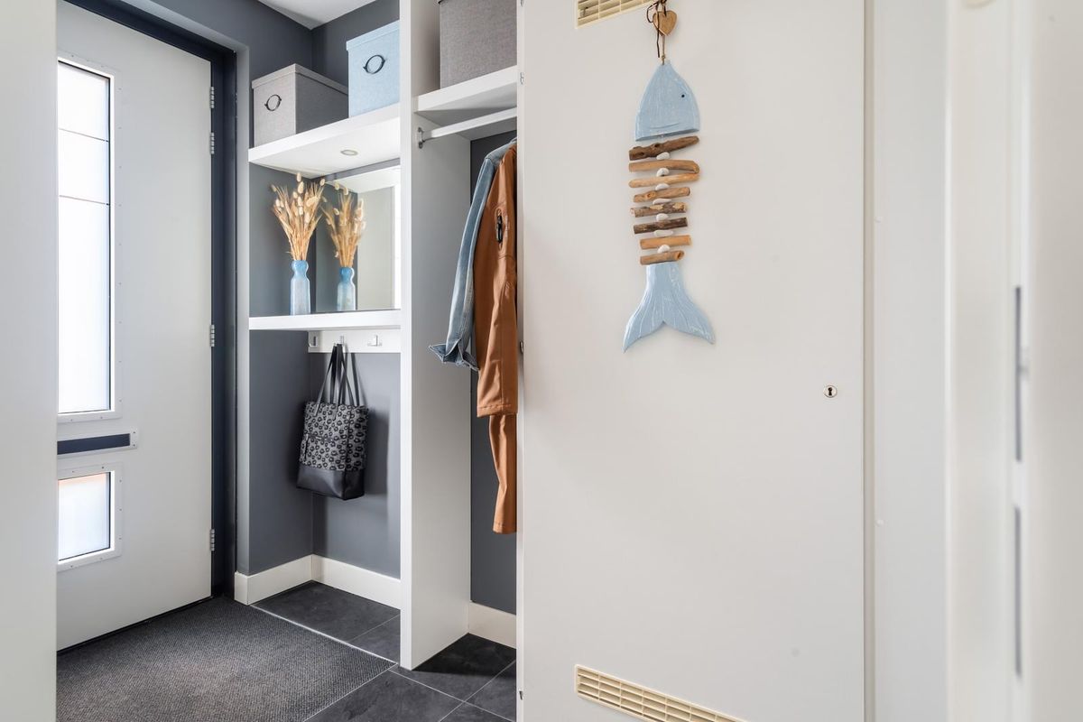 De wasruimte biedt naast veel extra bergruimte voldoende ruimte voor wasmachine en wasdroger. Aan de andere zijde een praktische inloopkast met de opstelplaats van de CV-ketel.