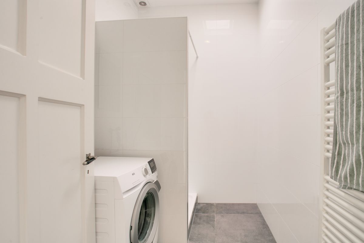 • Nette badkamer met douche, wastafel, wasmachineaansluiting en designradiator.