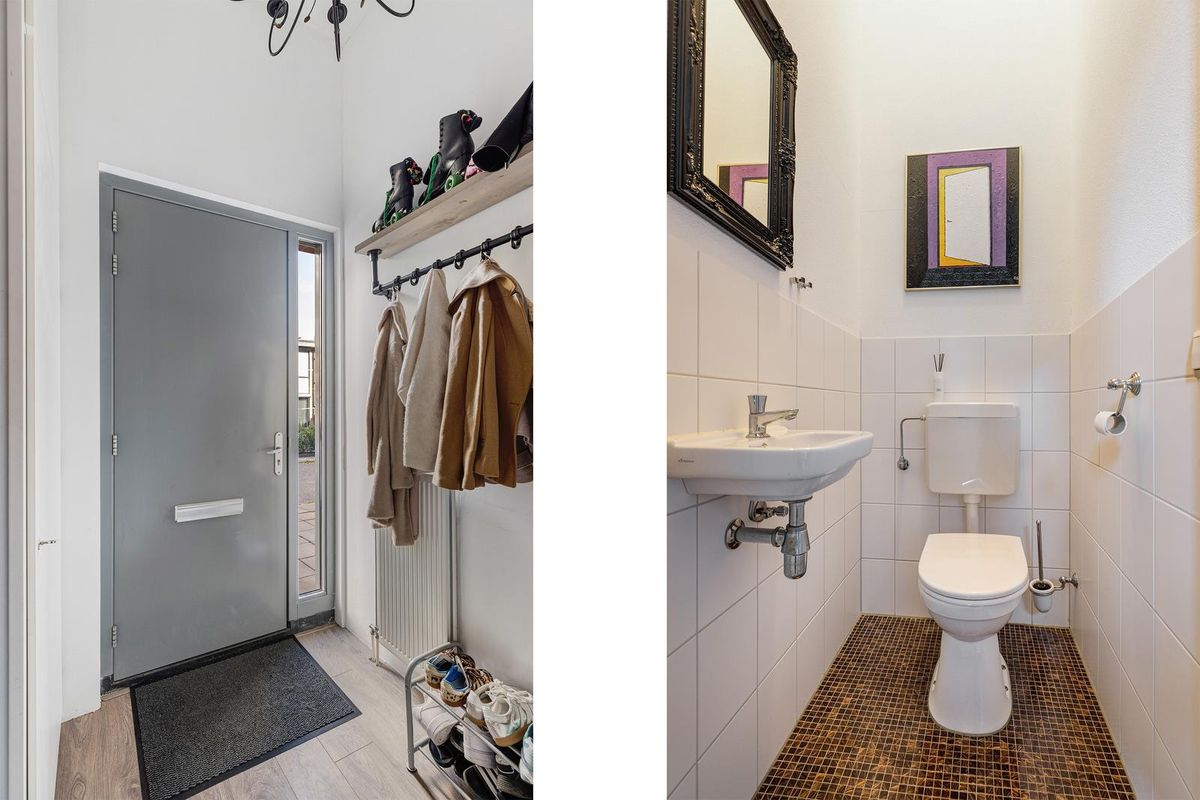 Bij aankomst valt direct de ruime oprit op, met plek voor twee auto’s. Vanuit hier is er toegang tot de garage en de entree van de woning. De garage beschikt over een handige vliering wat zorgt voor veel extra opbergruimte. In de hal bevinden zich het toilet en de trapopgang naar de eerste verdieping.