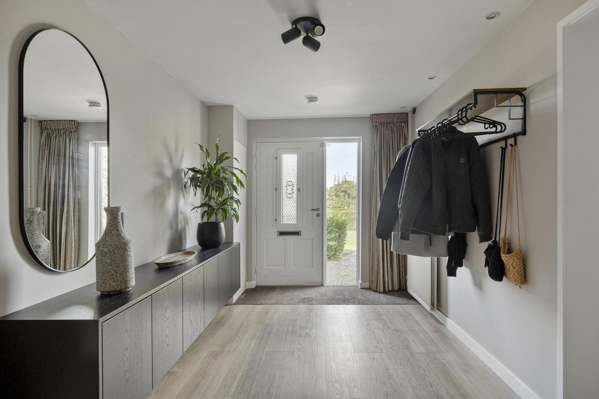 Via de oprit en de fraai aangelegde voortuin is de entree van de woning te bereiken. Bij binnenkomst tref je een royale hal met volop mogelijkheid voor een grote garderobehoek en bijv. voor het plaatsen van een kast. In de hal is tevens een separate meterkast aanwezig.