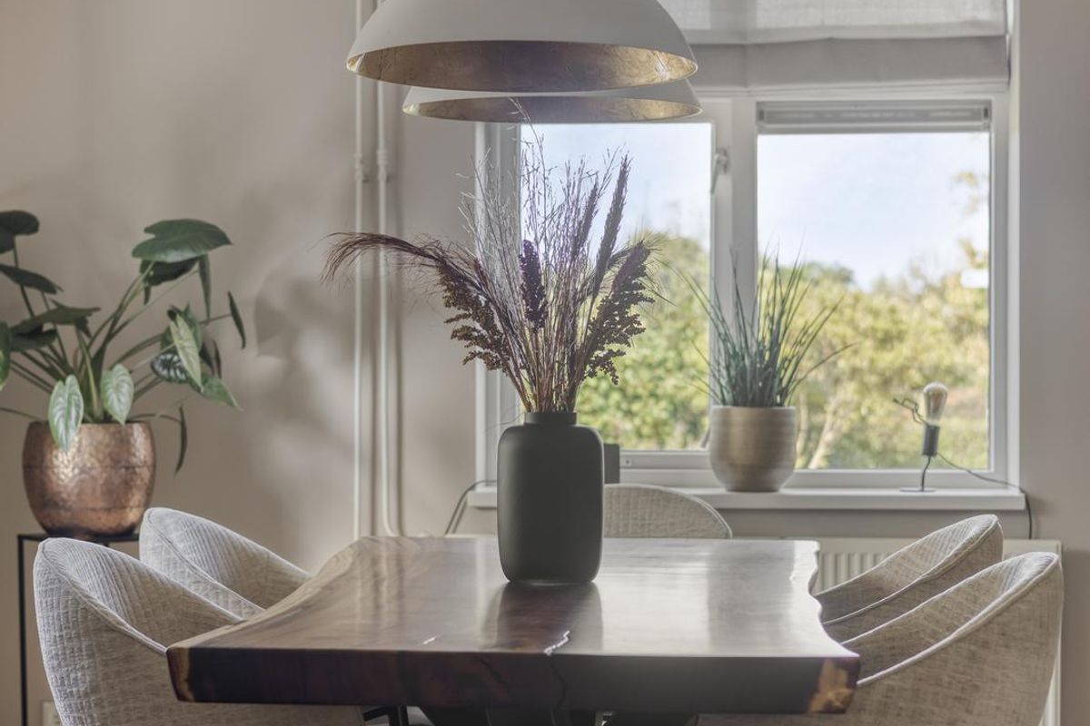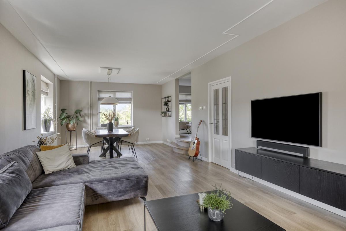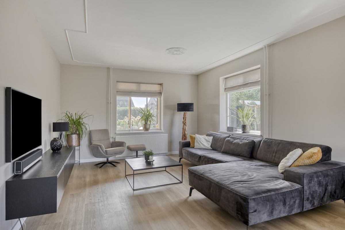 De strak afgewerkte woonkamer is over de gehele lengte van de woning gesitueerd. De woonkamer heeft een oppervlakte van circa 38 m2, er is dan ook volop ruimte voor een royale zithoek en een extra eethoek. Het plafond van de woonkamer is fraai afgewerkt met sierlijsten.