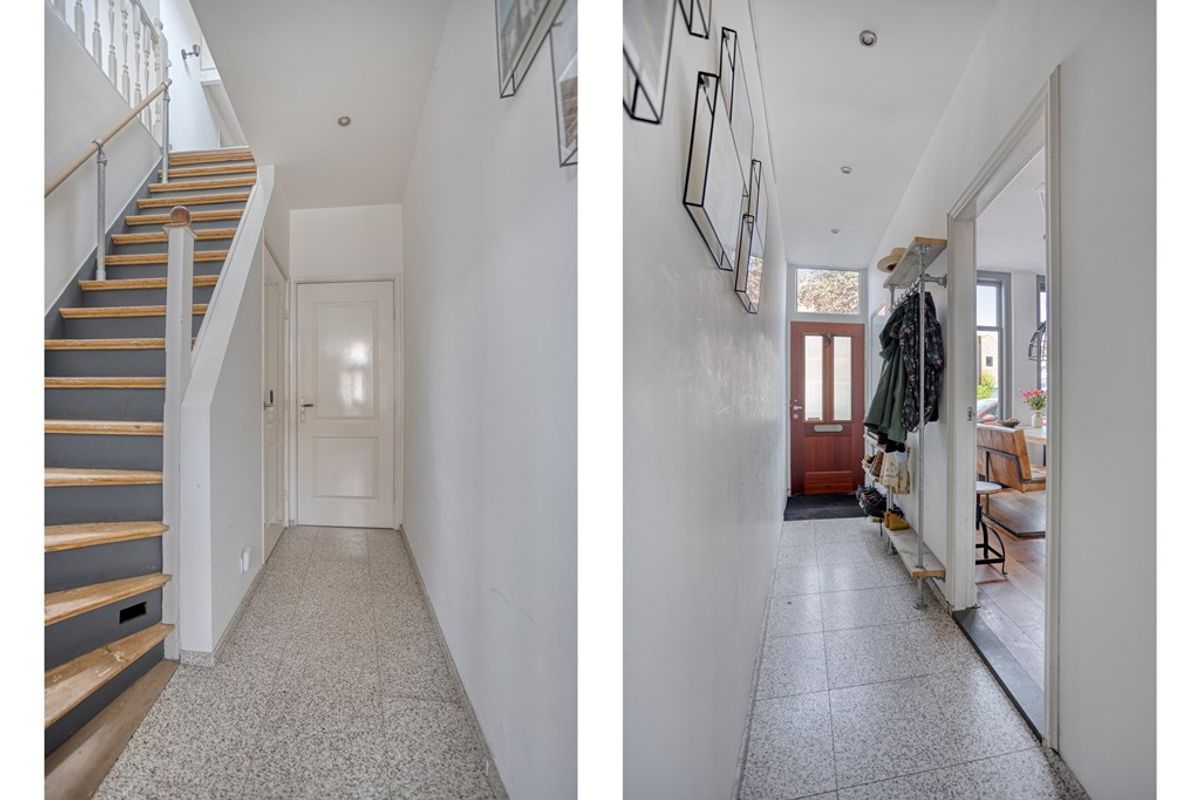 Zodra je de lange hal binnenstapt, voel je de ruimte. Aan het einde een riant toilet met een fontein en onder de mooie authentieke trap ligt een diepe kelder. Door naar de woonkamer.