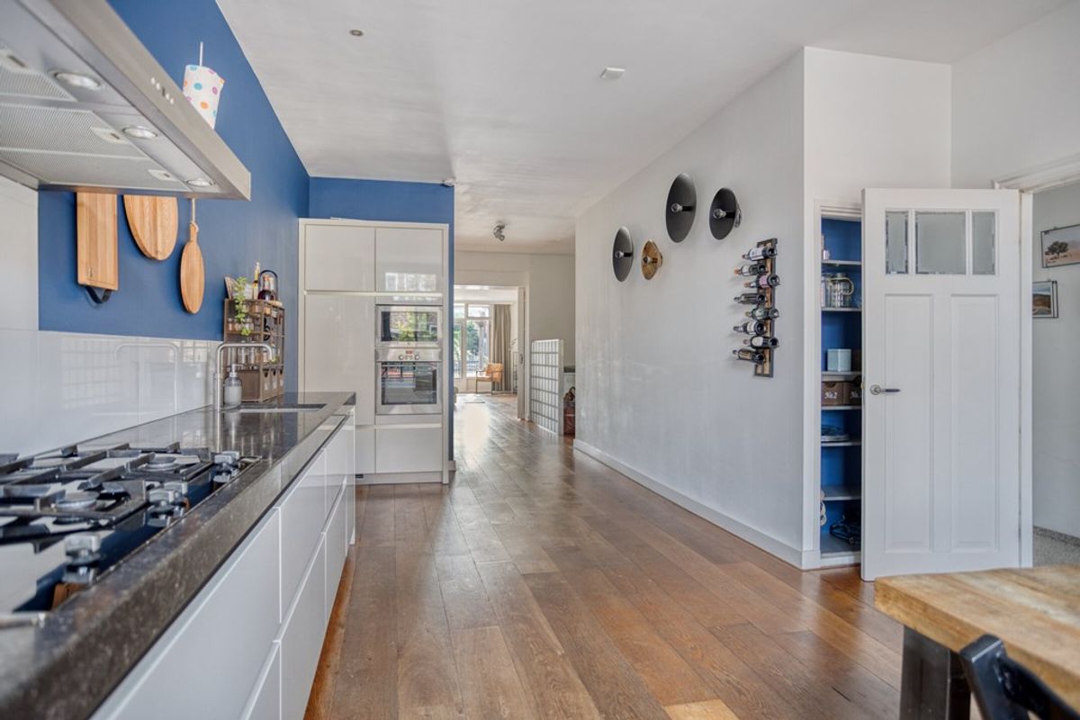 Aan de voorzijde ligt een royale eetkamer met open keuken. Grote schuiframen laten veel licht binnen en geven zicht op het straatleven. De keuken is compleet en afgewerkt met Belgisch hardsteen, een fijne plek voor lange maaltijden of een druk gezinsontbijt. Alle denkbare apparatuur is aanwezig, maar dat zie je vanzelf bij de bezichtiging.