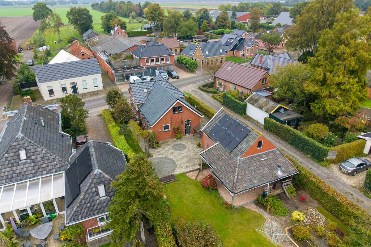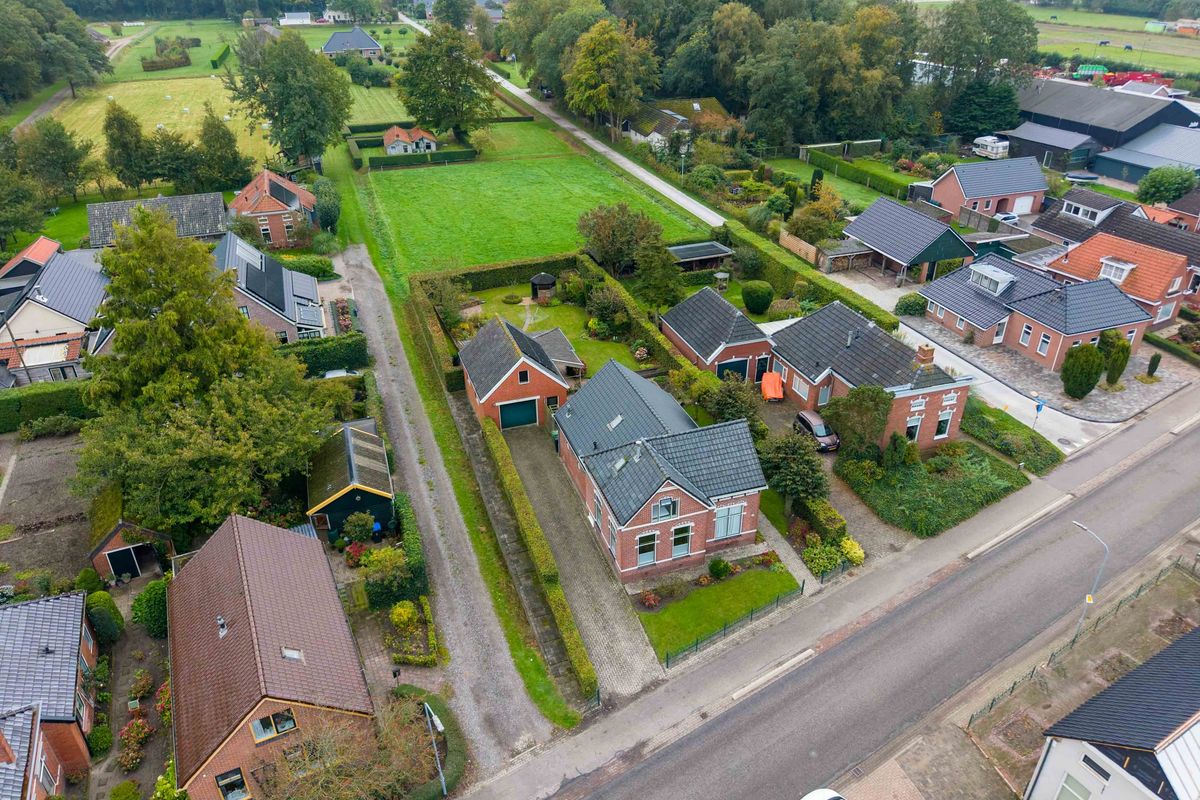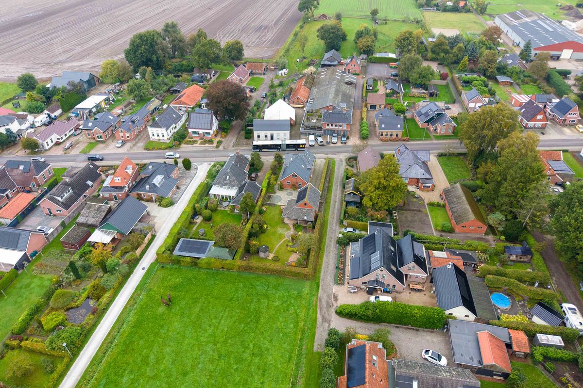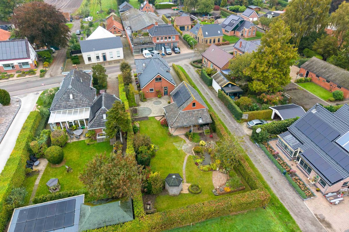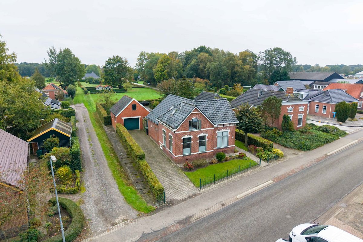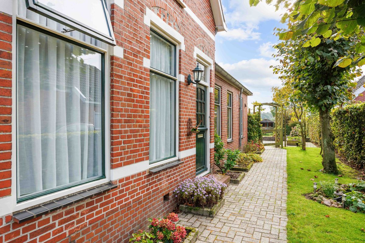 Aan de linkerzijkant is een oprit naar de garage/schuur, voorts een afscheidingssloot.
