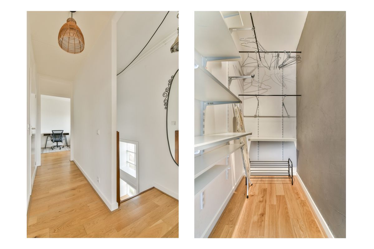 The top floor offers two well-proportioned bedrooms on either side of the corridor. The bedroom at the front provides access to the second balcony. Between the bedrooms are a walk-in closet and the modern bathroom with underfloor heating, a spacious walk-in shower, washbasin, washing machine connection, and a second toilet. The second bedroom is very spacious and overlooks the canal.