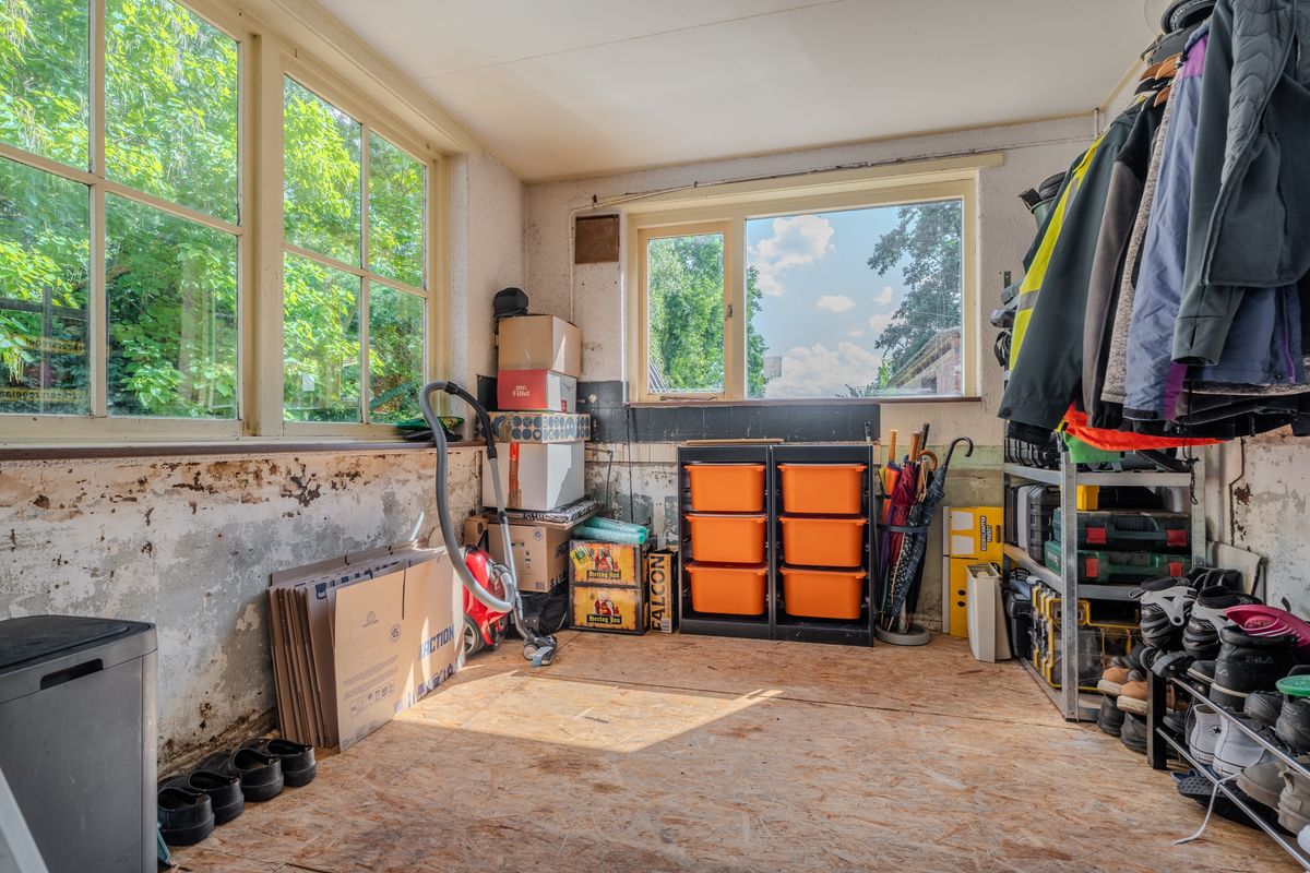 De tuin is eenvoudig aangelegd en biedt verschillende terrassen, ideaal om te genieten van zon en buitenleven. Verder beschikt de tuin over een vrijstaande houten garage en een stenen schuur, wat veel praktische opslagruimte biedt. Langs de woning bevindt zich een oprit met voldoende parkeergelegenheid op eigen terrein, zodat u altijd comfortabel uw auto kwijt kunt.