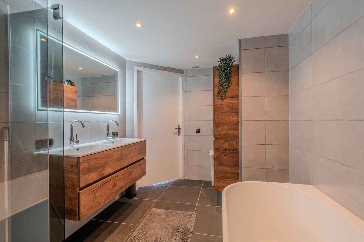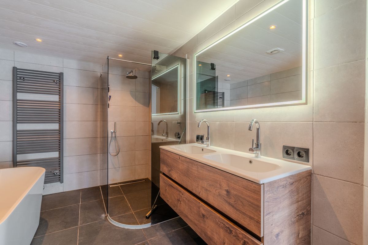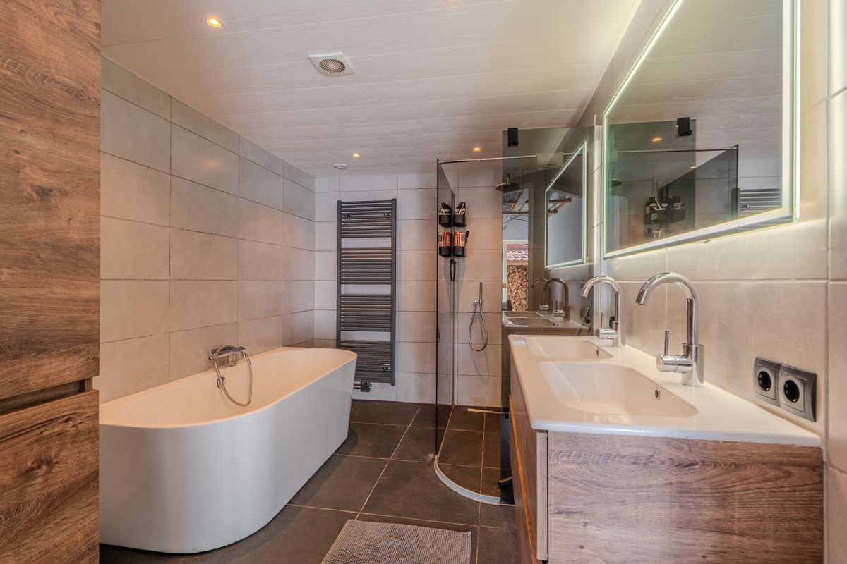 De badkamer is voorzien van een douchecabine, ligbad, designradiator en een dubbele wastafel met meubel.