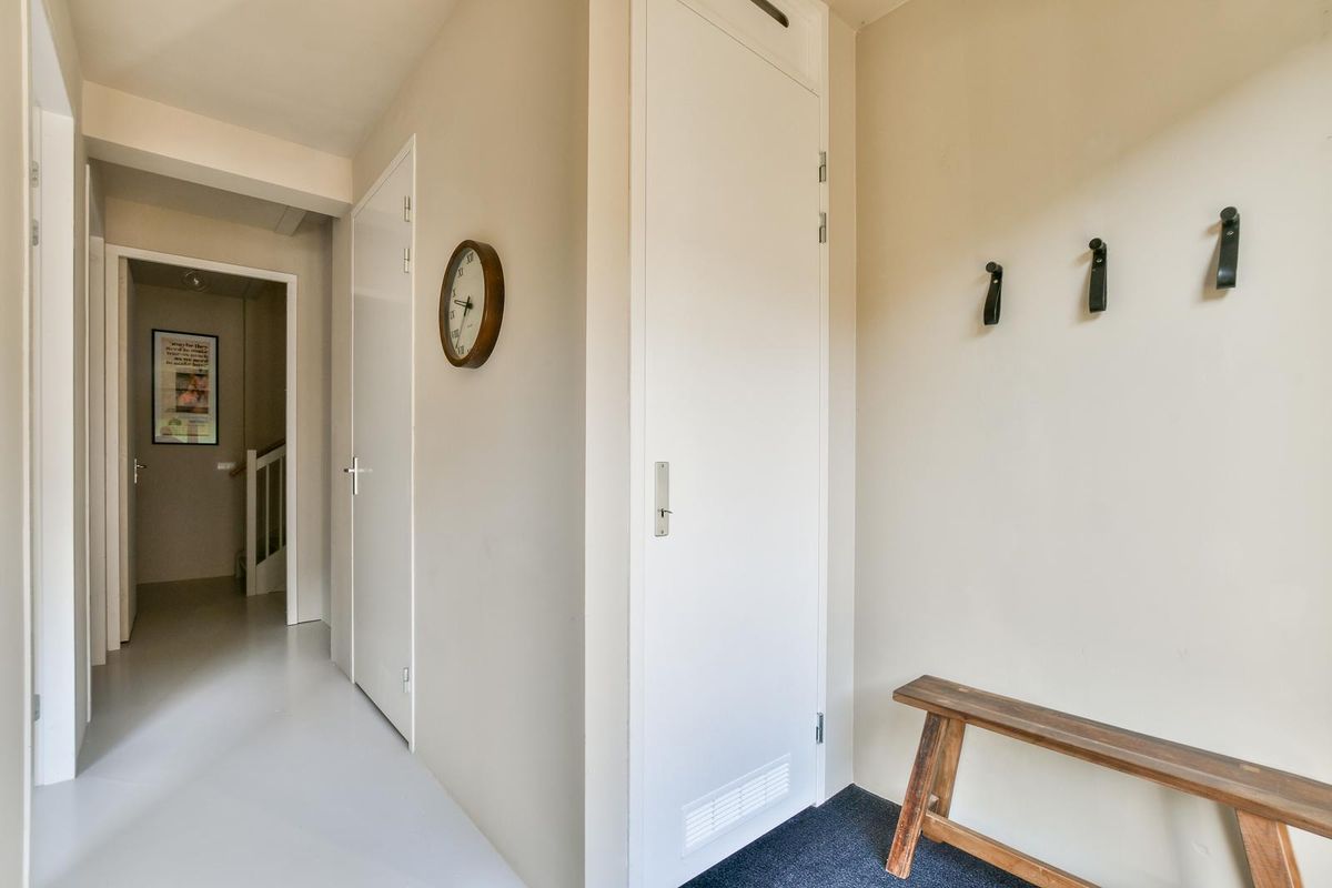 Bij binnenkomst op de begane grond word je verwelkomd in een compacte entreehal. Direct aan de linkerkant bevindt zich de eerste slaapkamer, een fijne ruimte die ideaal is als logeer- of werkkamer. Loop je verder de hal in, dan kom je langs een praktische bergkast met aansluiting voor een wasmachine, ideaal als wasruimte of extra opbergruimte. Aan de andere zijde van de hal bevindt zich een aparte toiletruimte, keurig afgewerkt en voorzien van een fonteintje. Aansluitend tref je de moderne badkamer met een comfortabele inloopdouche en een stijlvol wastafelmeubel.