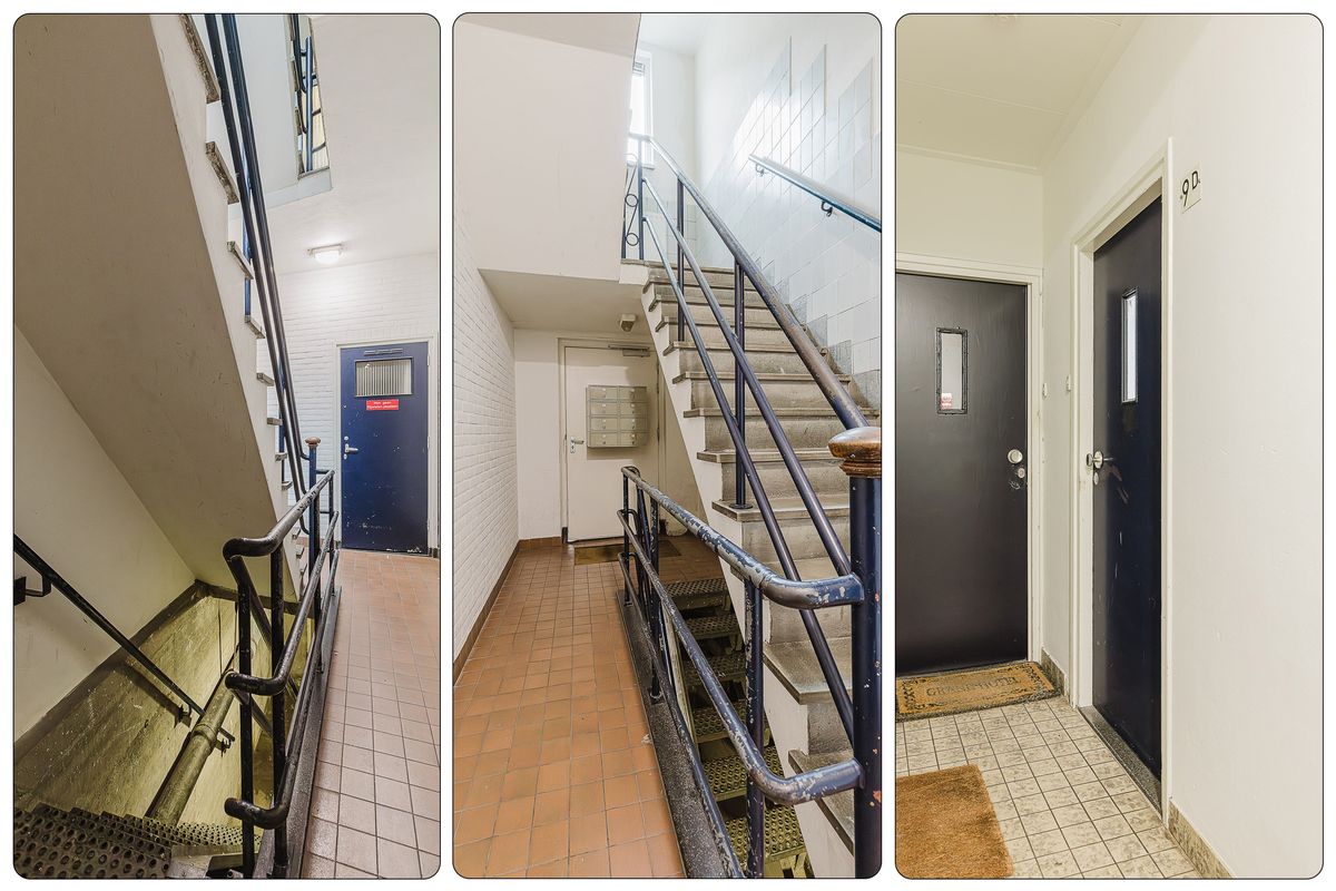 Centrale hal met brievenbussen, trappenhuis met toegang tot souterrain en verdiepingen.